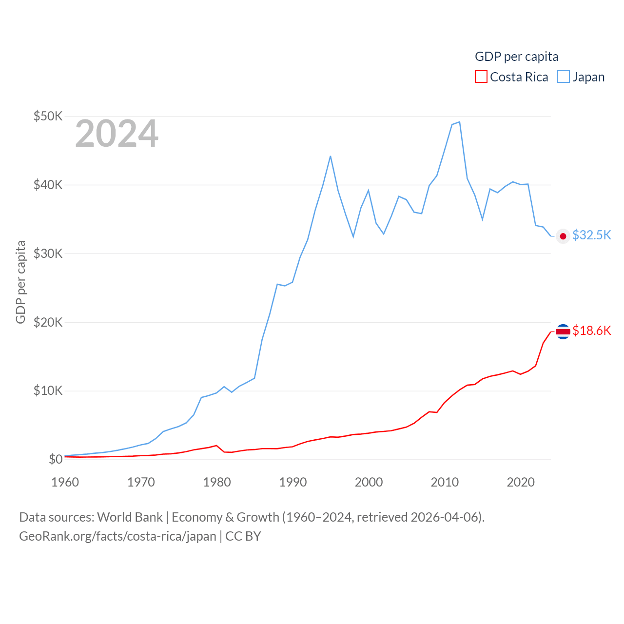 By GDP, Costa Rica ranks 73/197 ($95.4B) and Japan ranks 4/197 ($4.03T). By GDP per capita, Costa Rica ranks 62/197 ($18,587), while Japan ranks 38/197 ($32,487).
