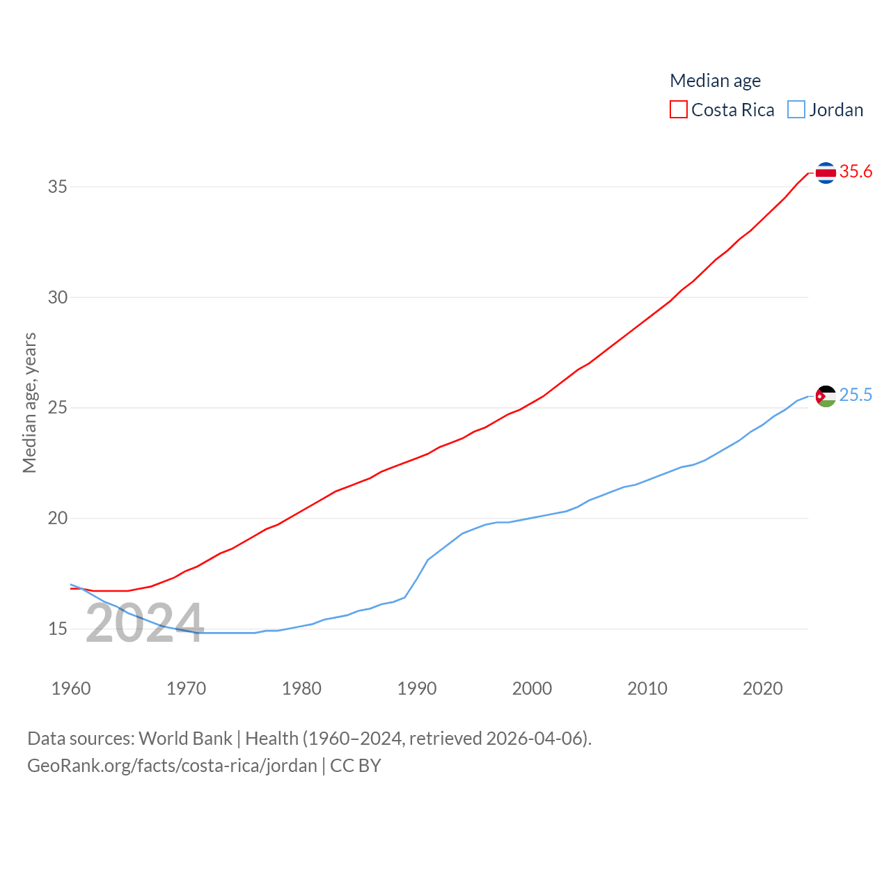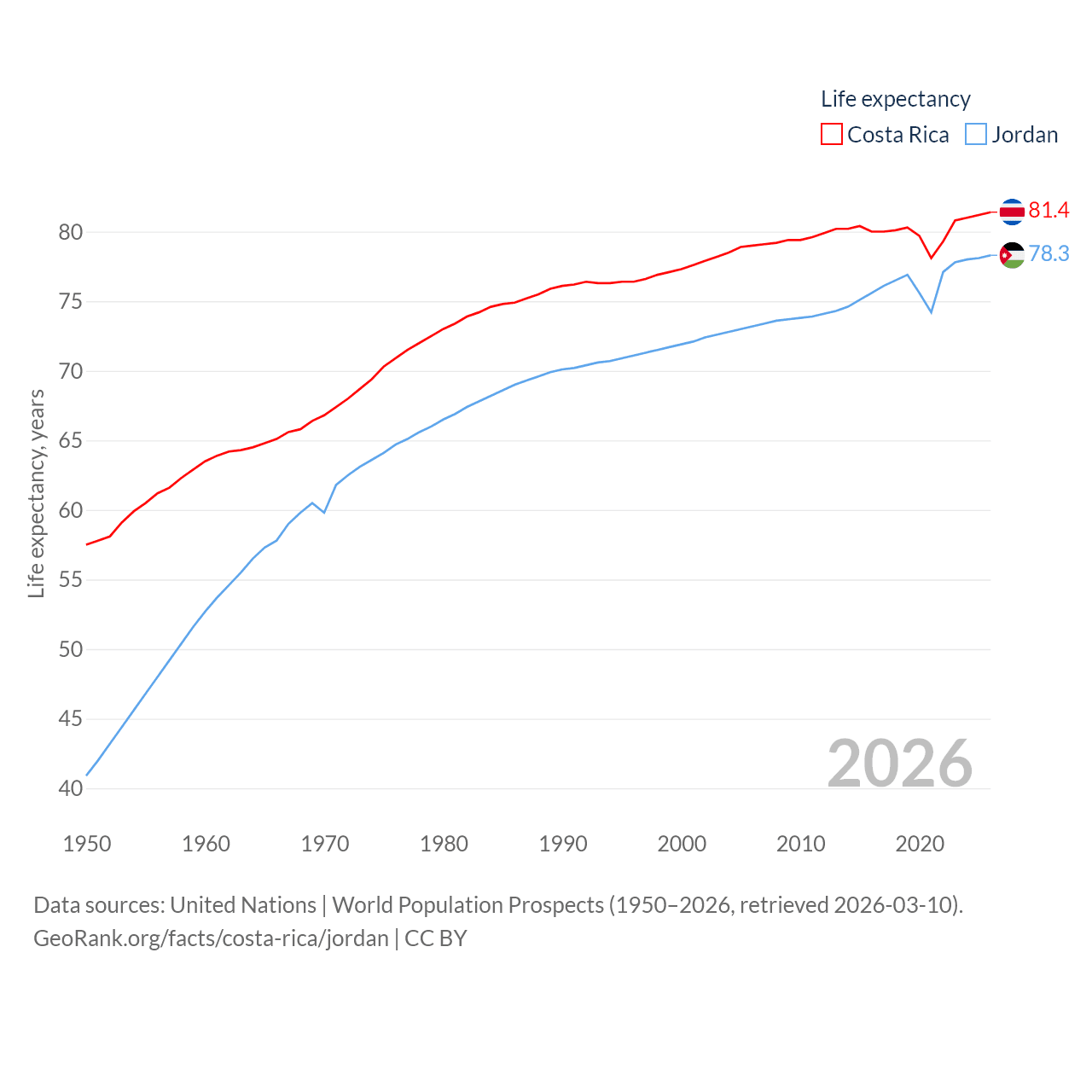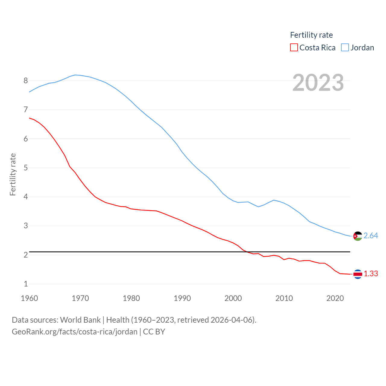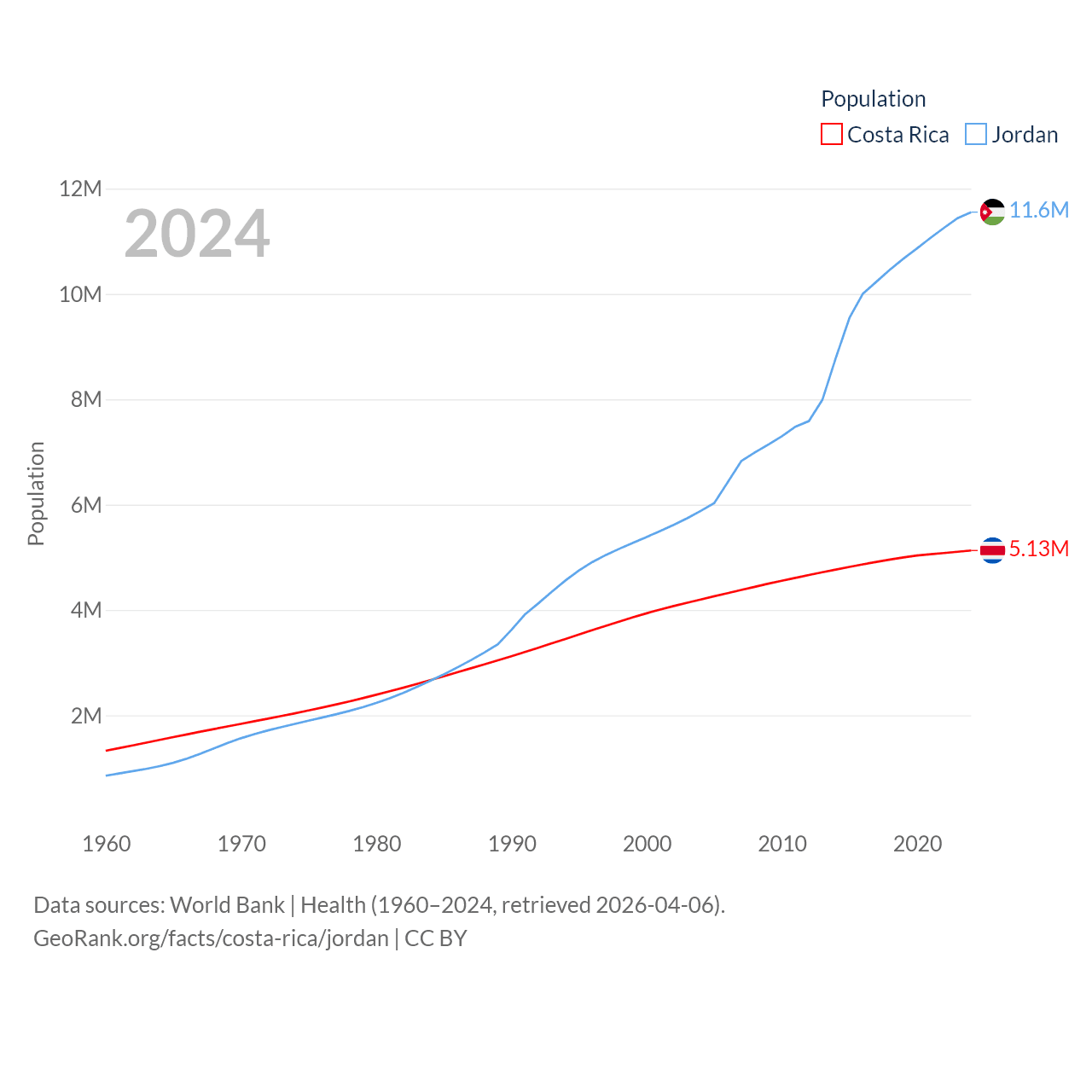 Costa Rica has a population of 5.13M (ranked 126/197), compared with 11.6M in Jordan (ranked 84/197). Costa Rica's land area is 19,714 sq mi versus 34,284 sq mi for Jordan (ranked 126th vs. 110th).