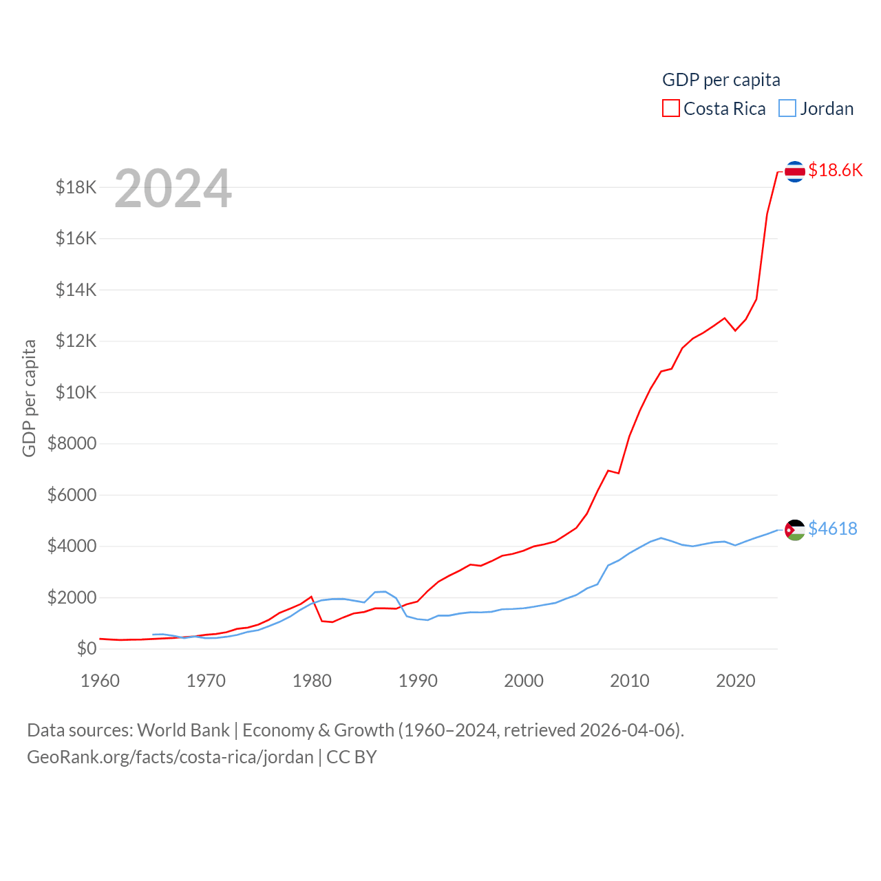 By GDP, Costa Rica ranks 73/197 ($95.4B) and Jordan ranks 90/197 ($53.4B). By GDP per capita, Costa Rica ranks 62/197 ($18,587), while Jordan ranks 123/197 ($4,618).