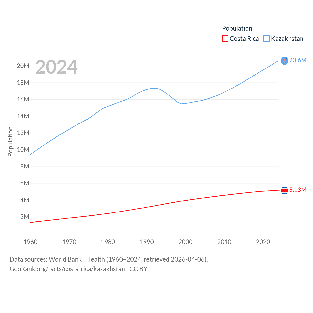 Costa Rica has a population of 5.13M (ranked 126/197), compared with 20.6M in Kazakhstan (ranked 64/197). Costa Rica's land area is 19,714 sq mi versus 1,042,360 sq mi for Kazakhstan (ranked 126th vs. 9th).