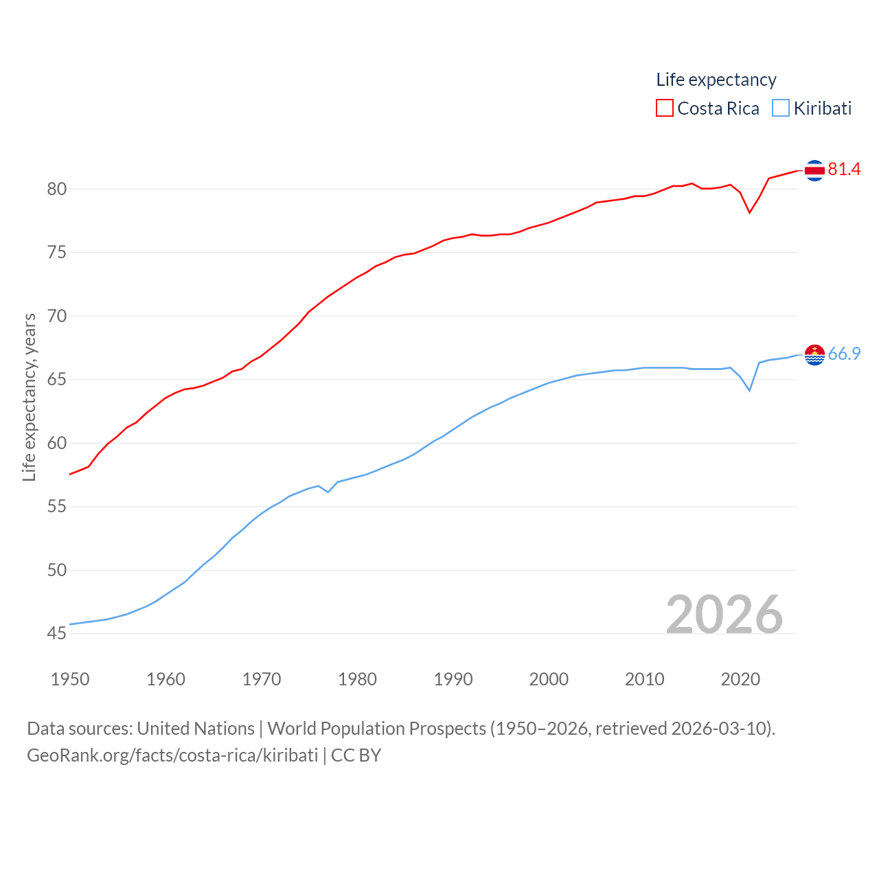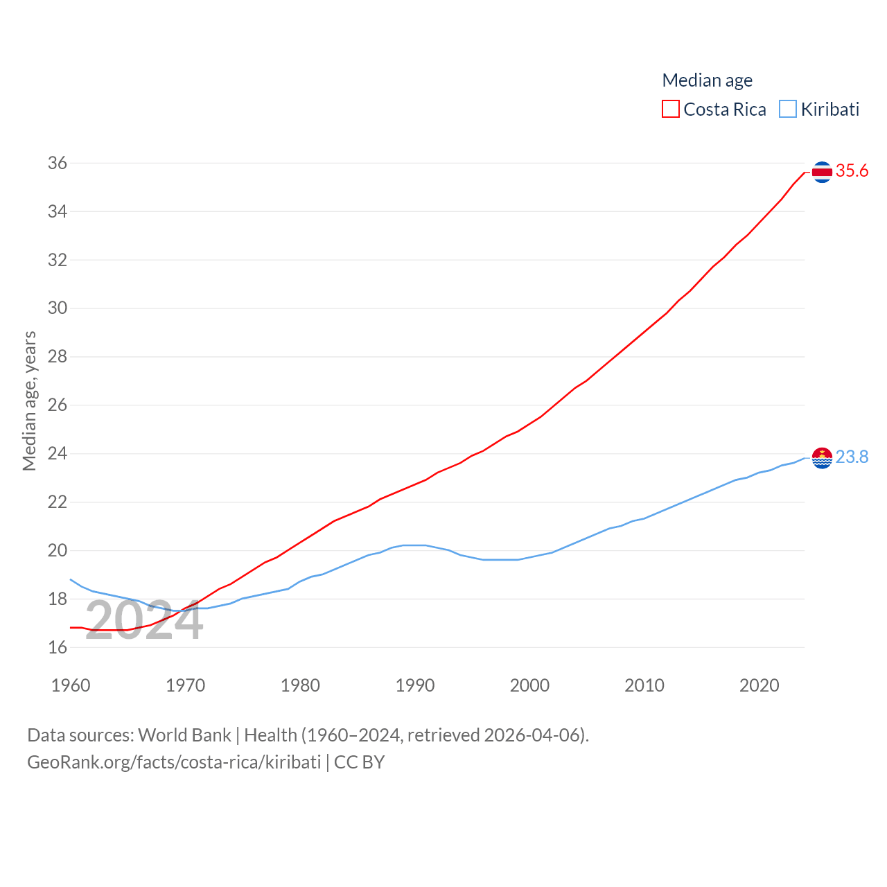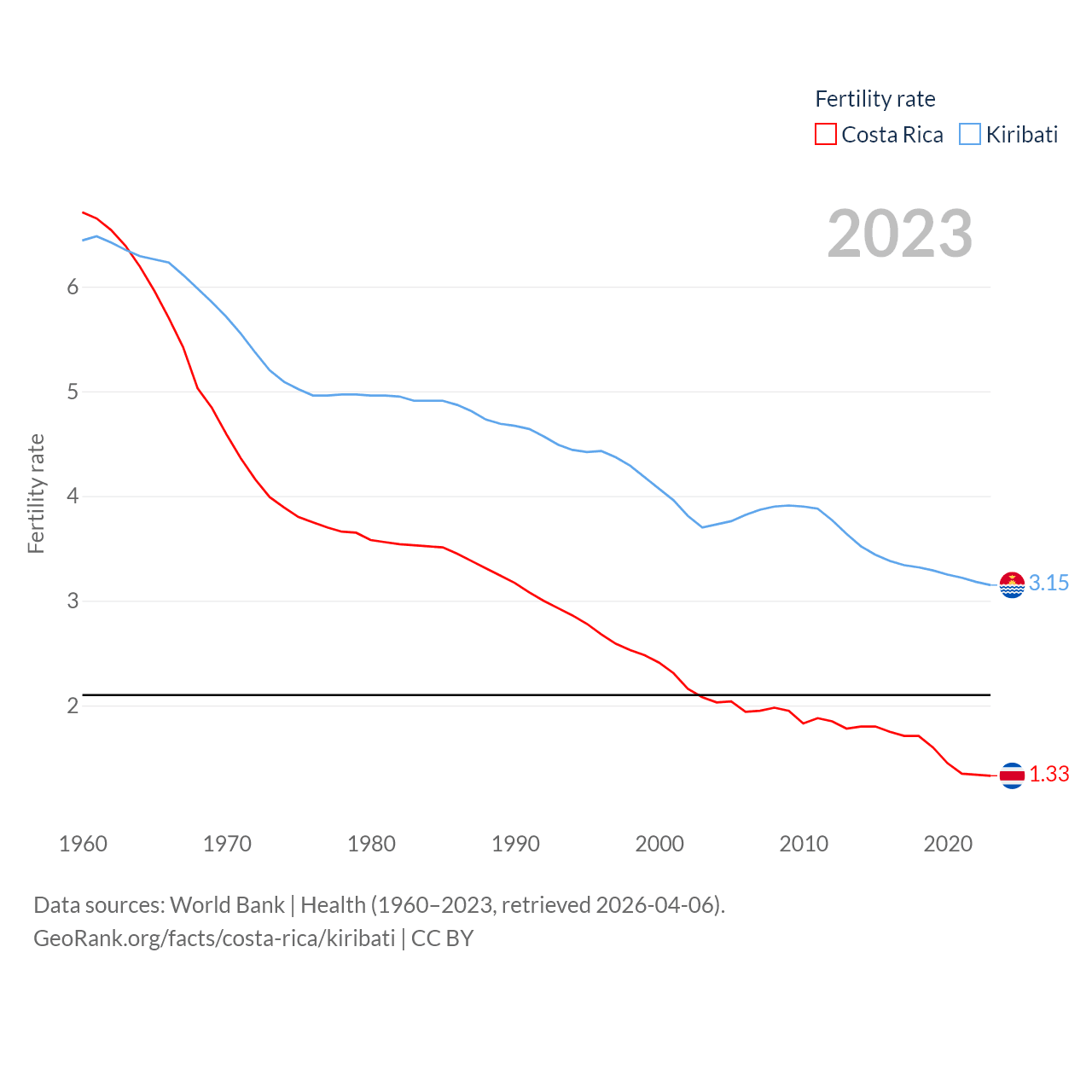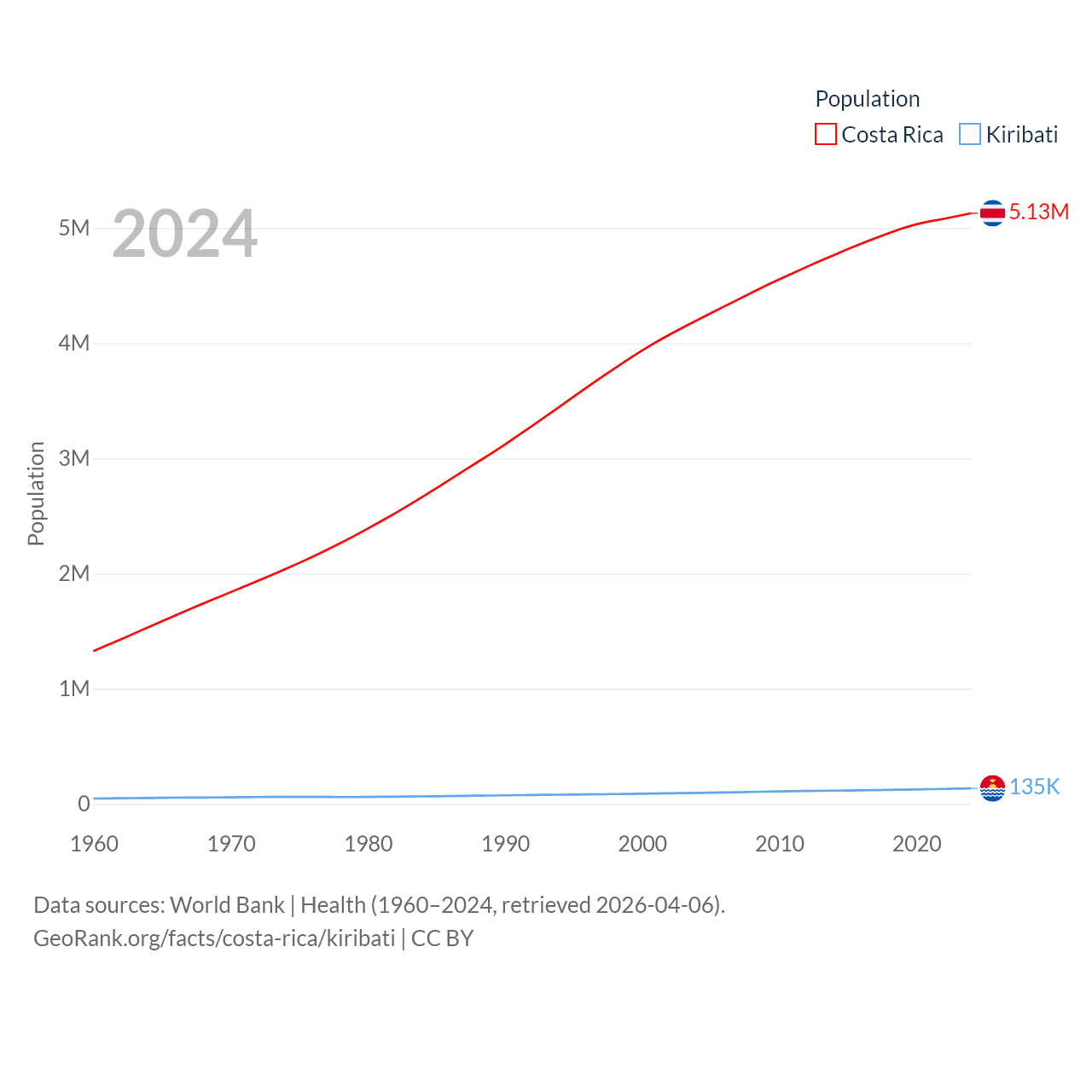 Costa Rica has a population of 5.13M (ranked 126/197), compared with 135K in Kiribati (ranked 180/197). Costa Rica's land area is 19,714 sq mi versus 313 sq mi for Kiribati (ranked 126th vs. 173rd).