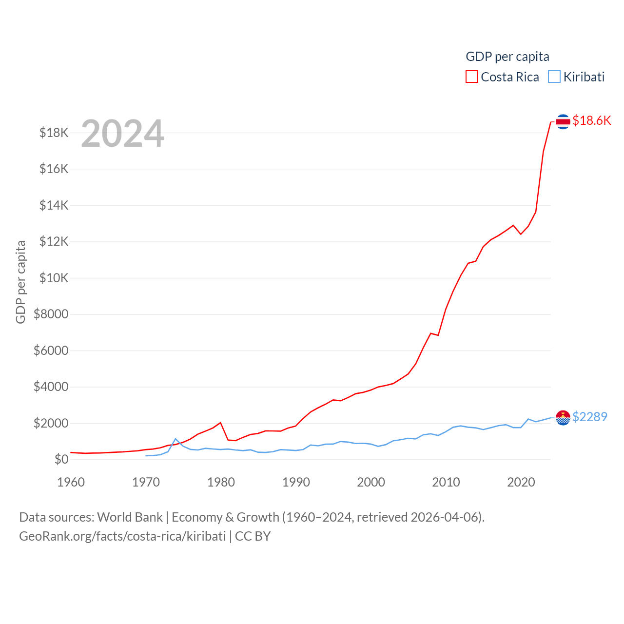 By GDP, Costa Rica ranks 73/197 ($95.4B) and Kiribati ranks 192/197 ($308M). By GDP per capita, Costa Rica ranks 62/197 ($18,587), while Kiribati ranks 152/197 ($2,289).