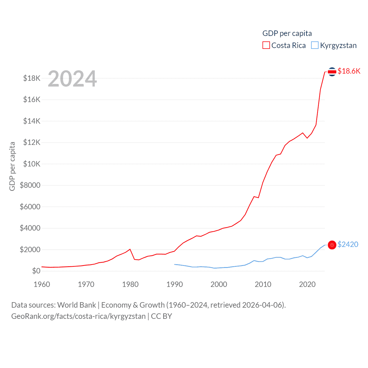 By GDP, Costa Rica ranks 73/197 ($95.4B) and Kyrgyzstan ranks 135/197 ($17.5B). By GDP per capita, Costa Rica ranks 62/197 ($18,587), while Kyrgyzstan ranks 150/197 ($2,420).