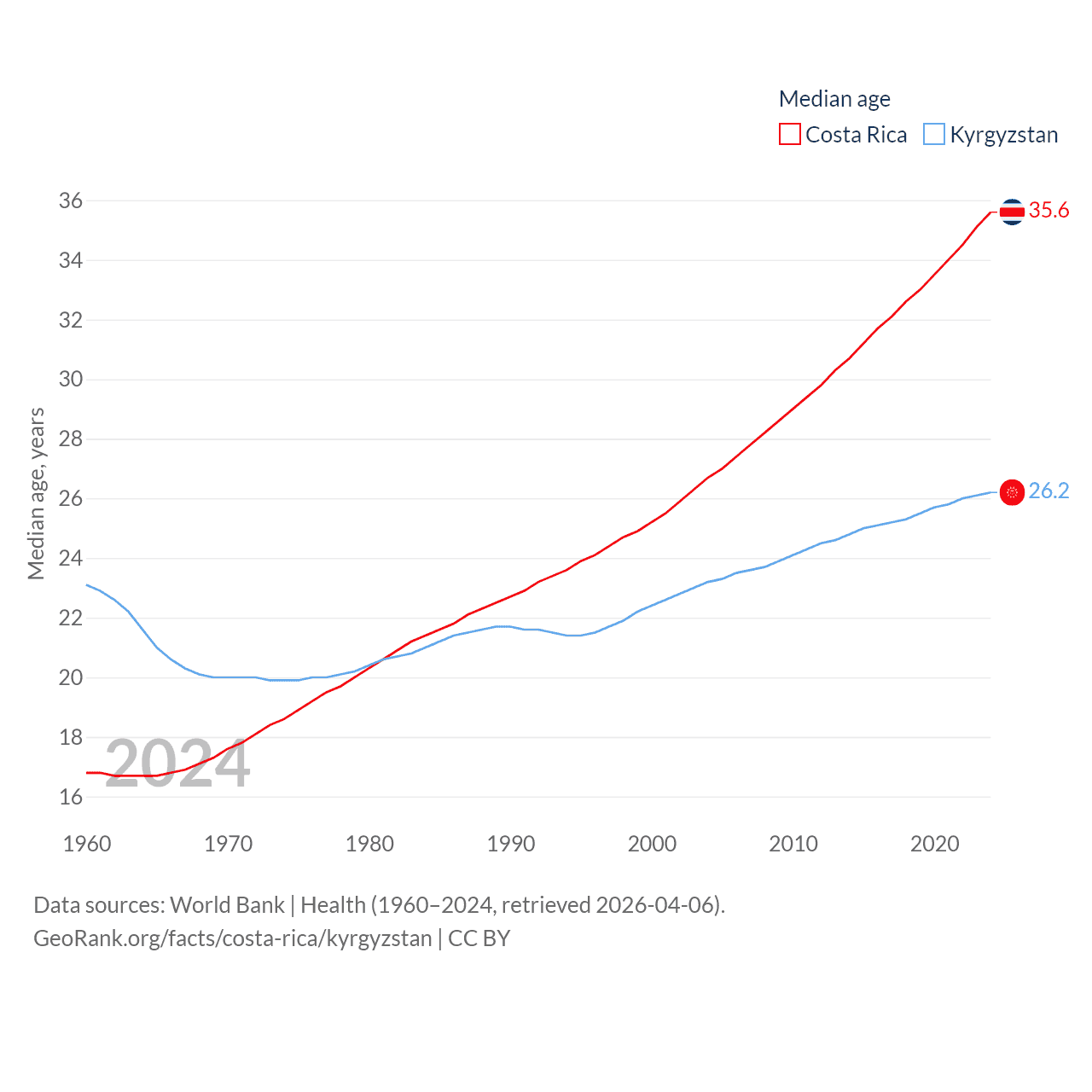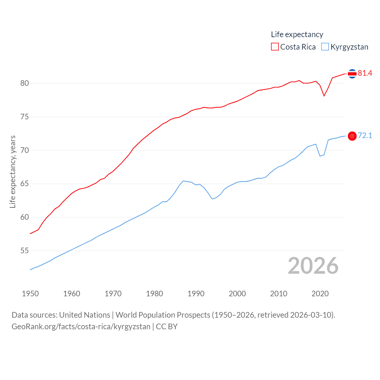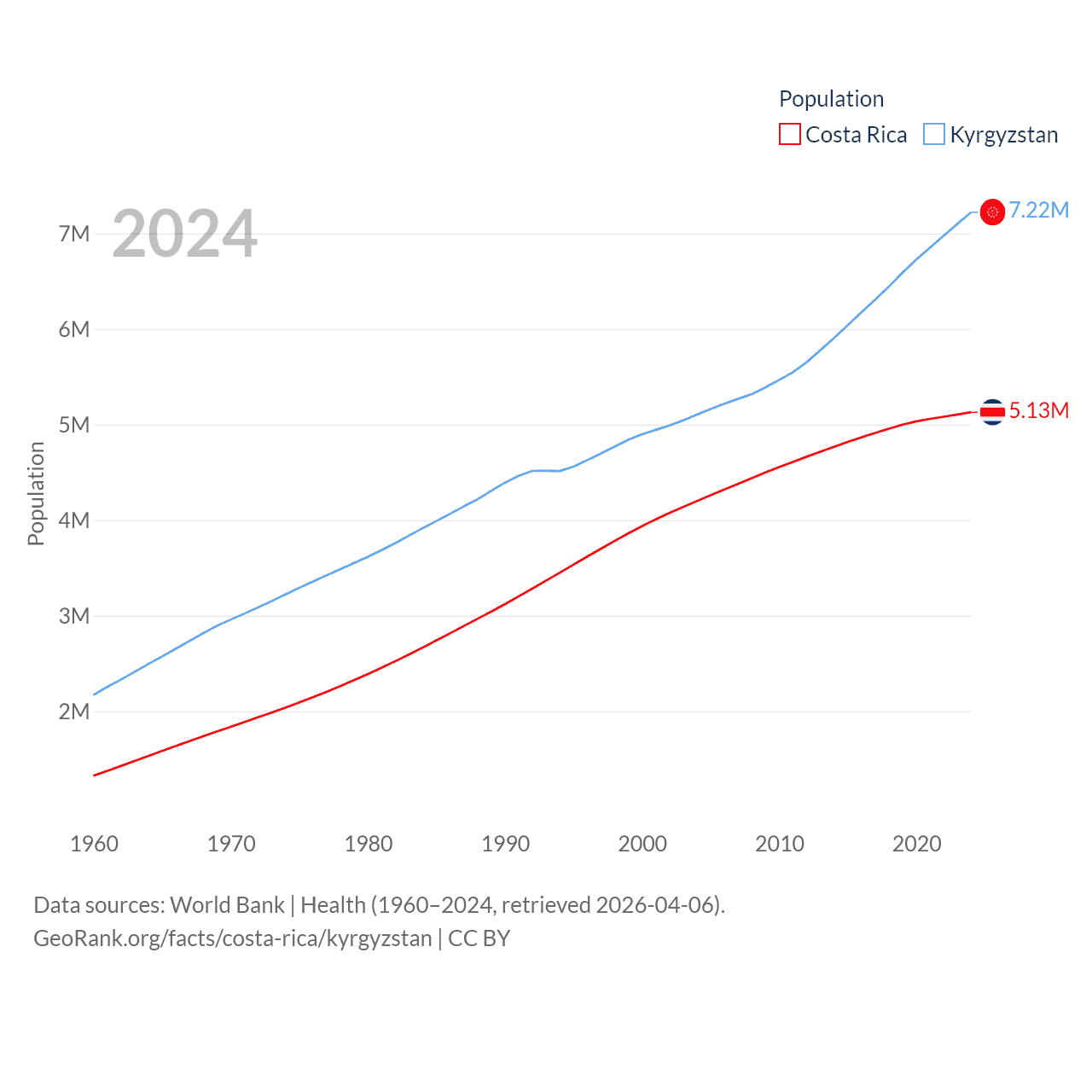 Costa Rica has a population of 5.13M (ranked 126/197), compared with 7.22M in Kyrgyzstan (ranked 106/197). Costa Rica's land area is 19,714 sq mi versus 74,054 sq mi for Kyrgyzstan (ranked 126th vs. 86th).