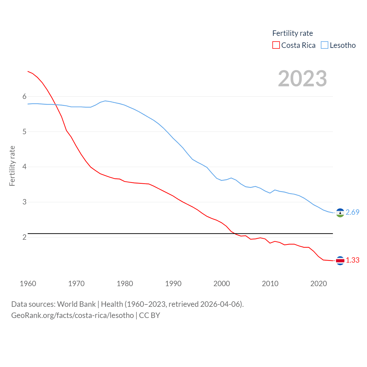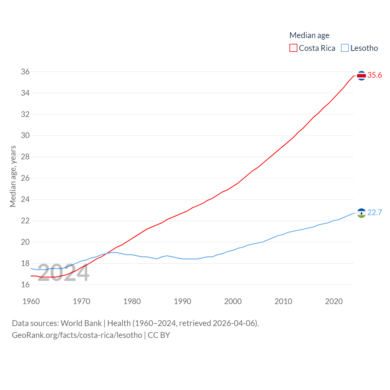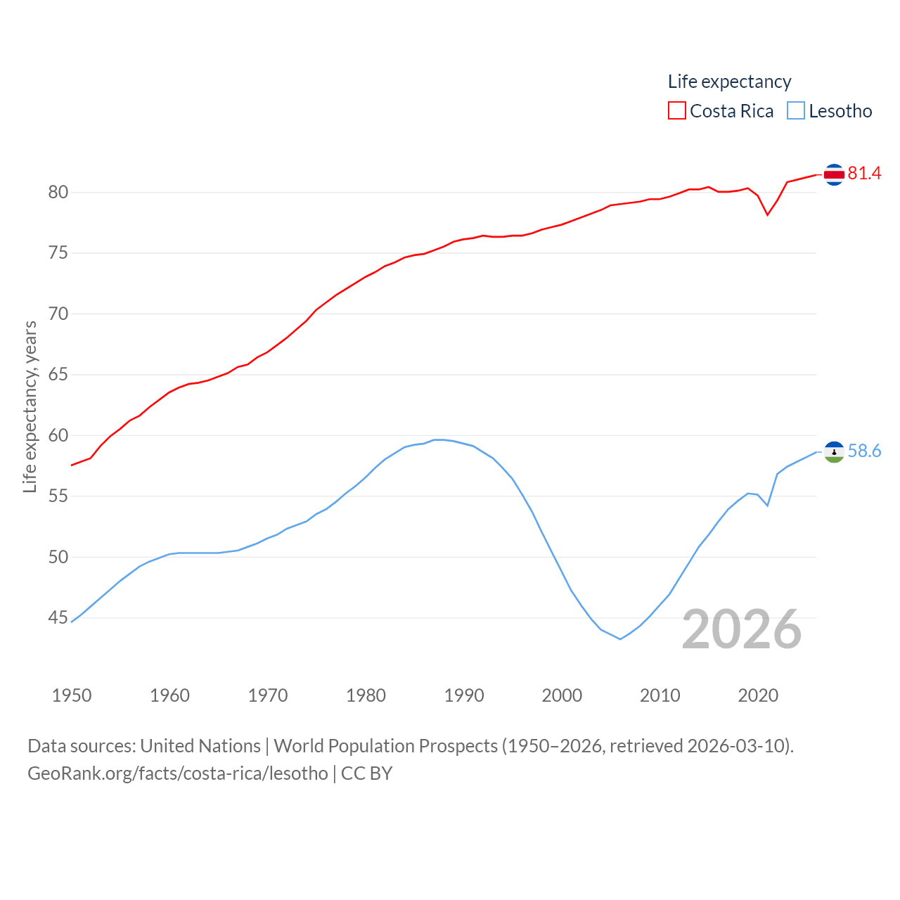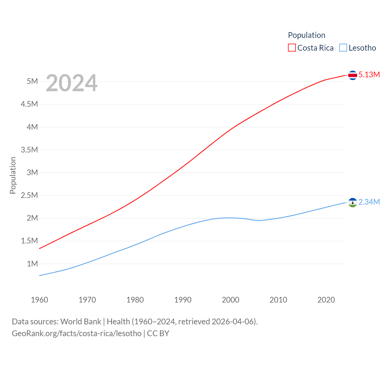 Costa Rica has a population of 5.13M (ranked 126/197), compared with 2.34M in Lesotho (ranked 145/197). Costa Rica's land area is 19,714 sq mi versus 11,722 sq mi for Lesotho (ranked 126th vs. 137th).