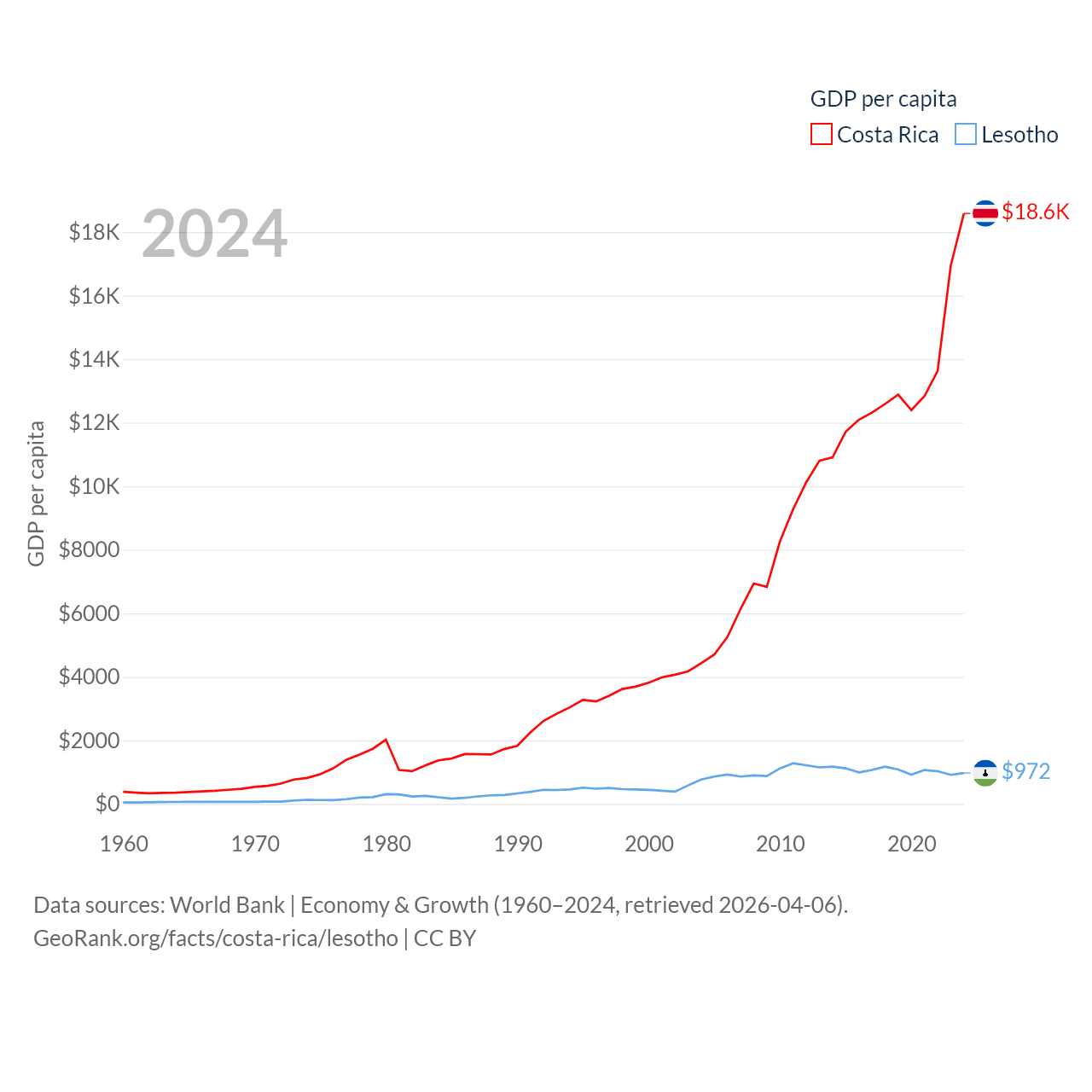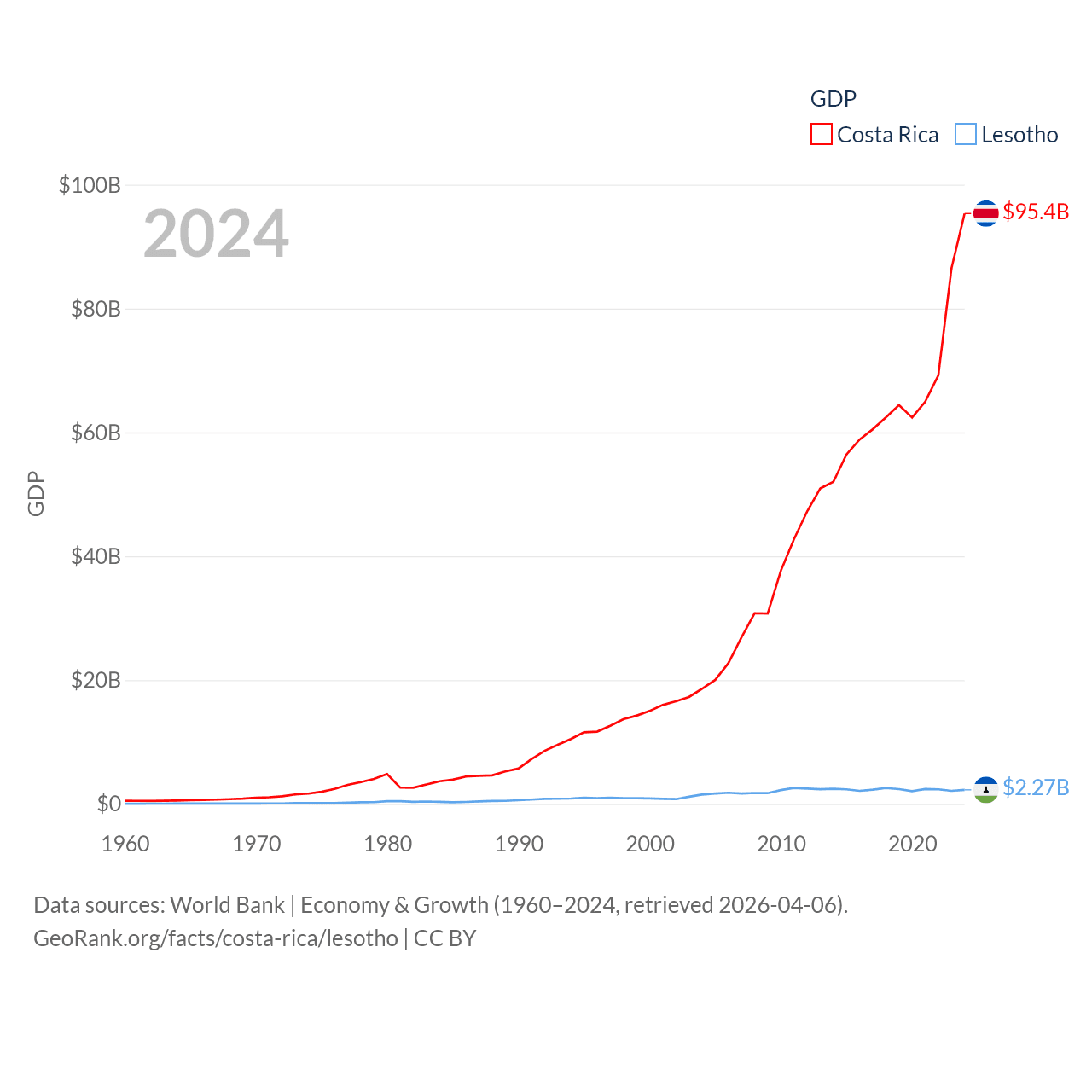 By GDP, Costa Rica ranks 73/197 ($95.4B) and Lesotho ranks 175/197 ($2.27B). By GDP per capita, Costa Rica ranks 62/197 ($18,587), while Lesotho ranks 181/197 ($972).