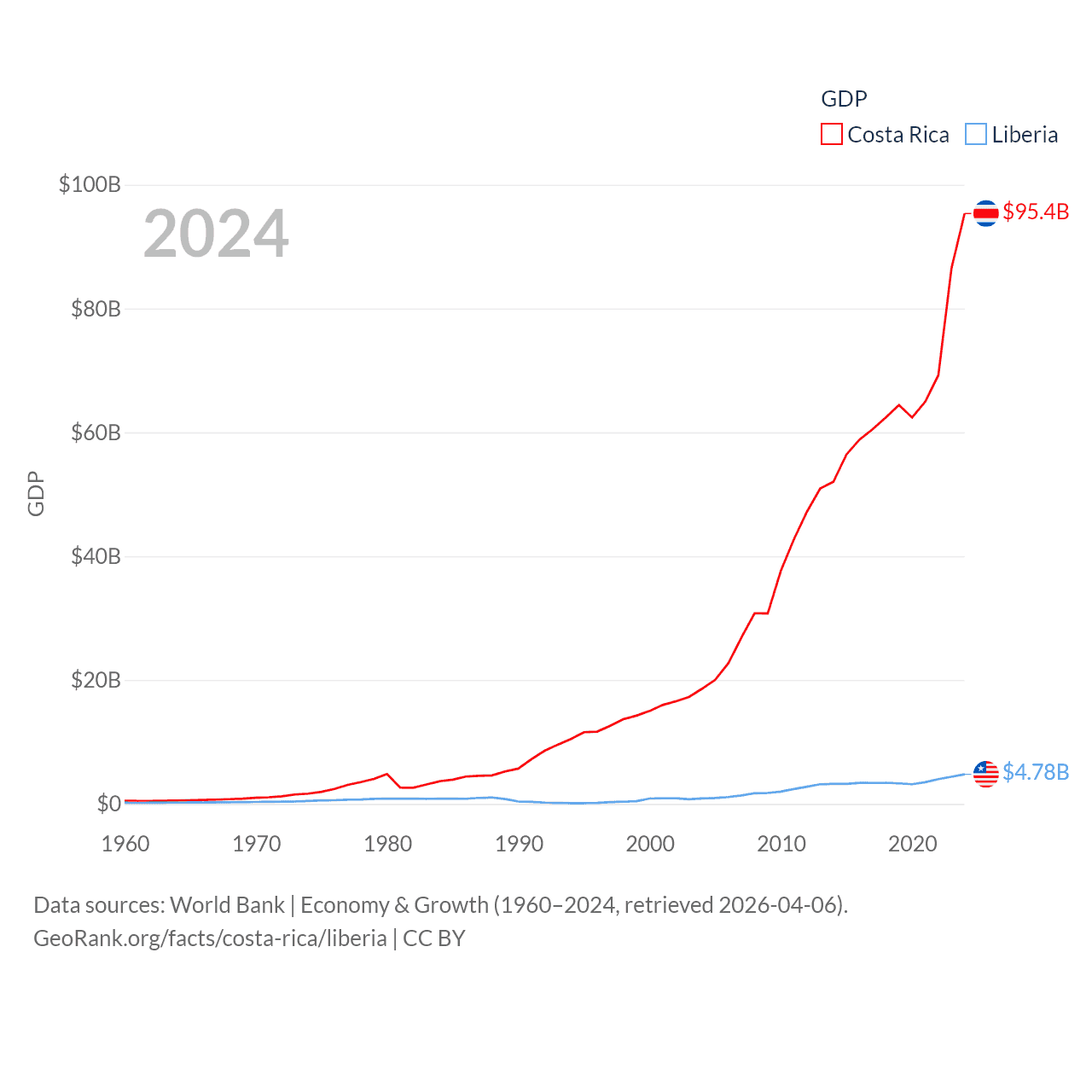 By GDP, Costa Rica ranks 73/197 ($95.4B) and Liberia ranks 163/197 ($4.78B). By GDP per capita, Costa Rica ranks 62/197 ($18,587), while Liberia ranks 184/197 ($851).
