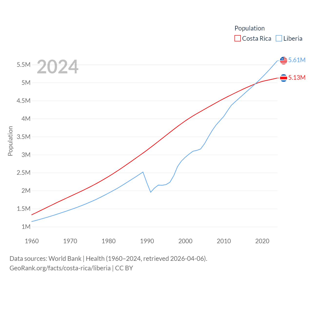 Costa Rica has a population of 5.13M (ranked 126/197), compared with 5.61M in Liberia (ranked 117/197). Costa Rica's land area is 19,714 sq mi versus 37,189 sq mi for Liberia (ranked 126th vs. 106th).