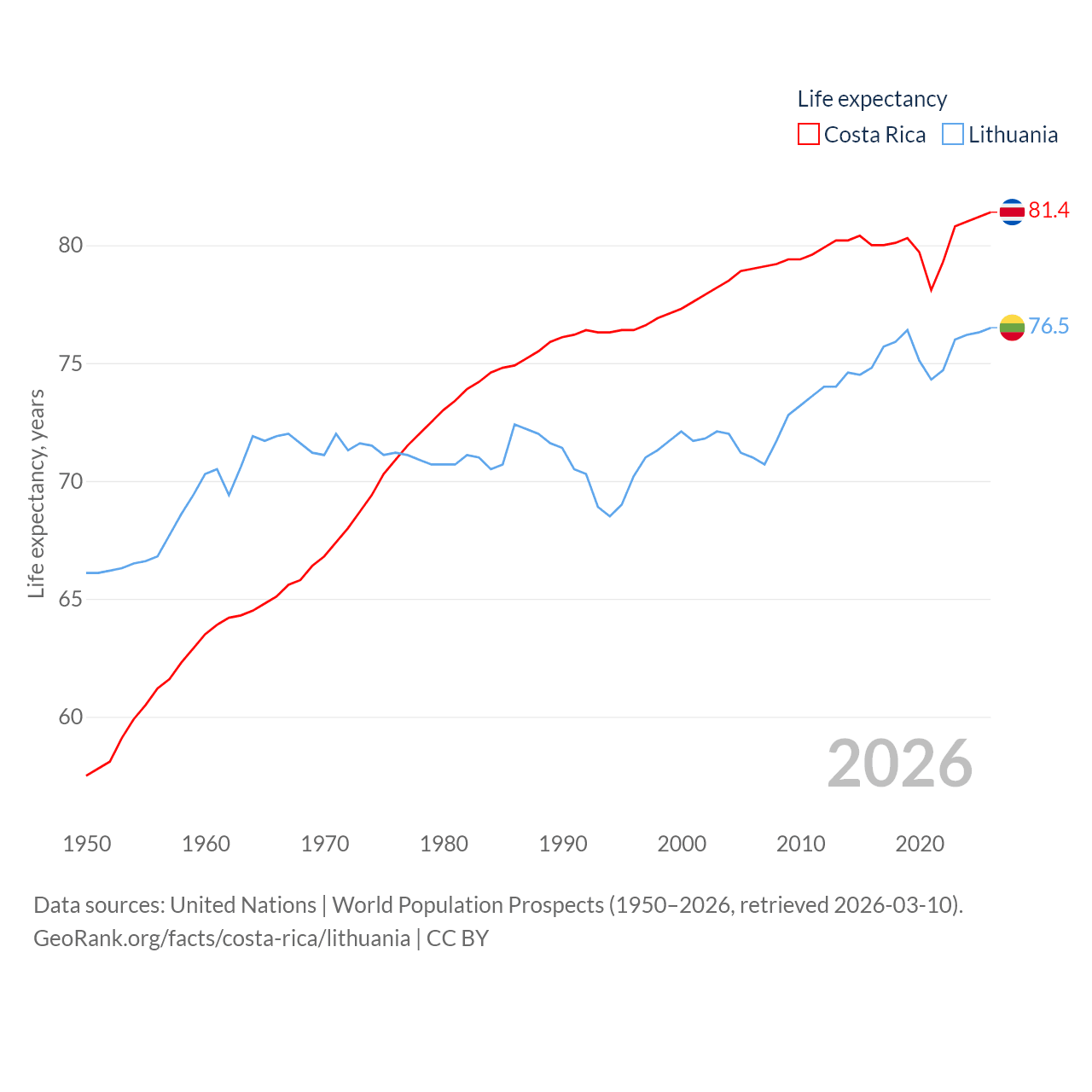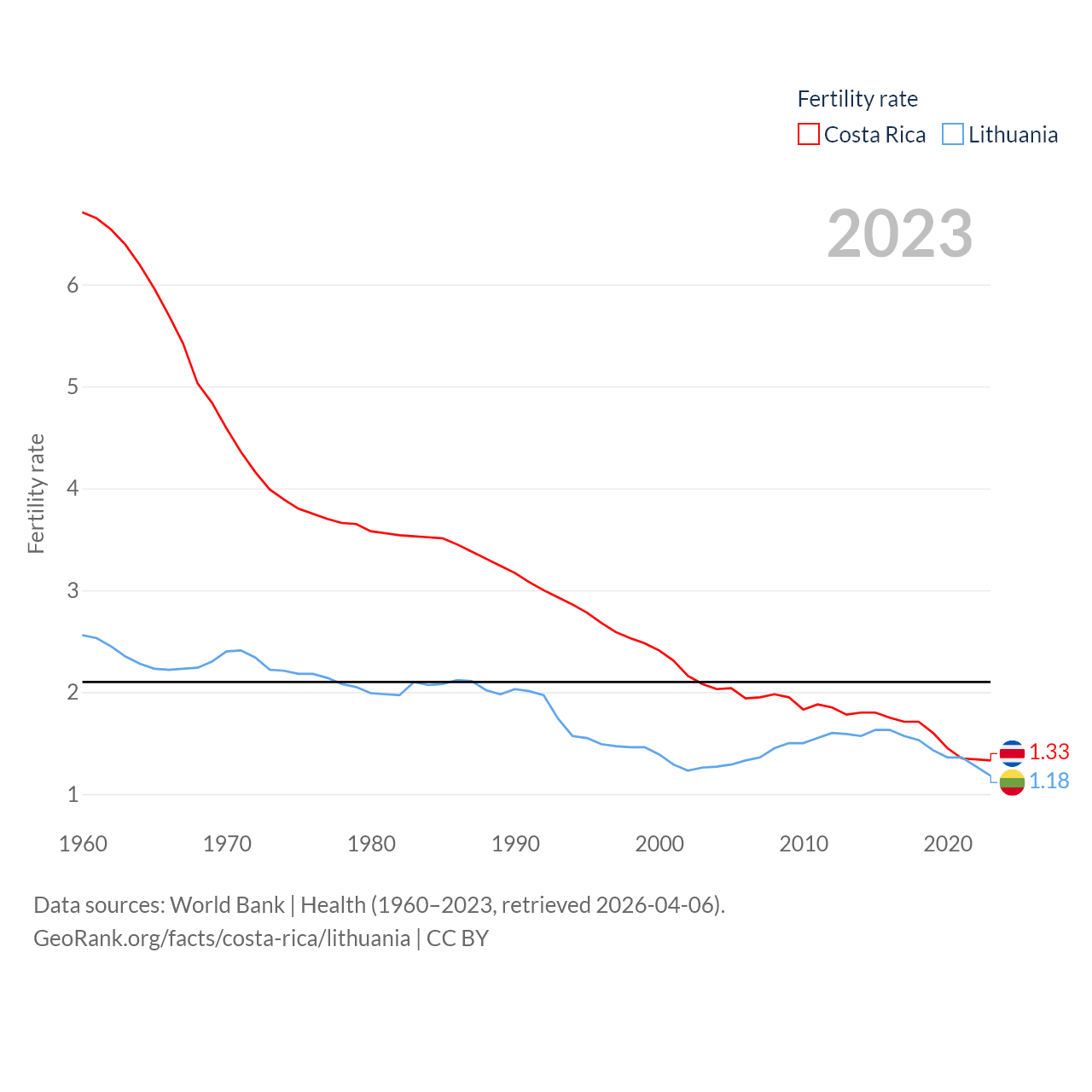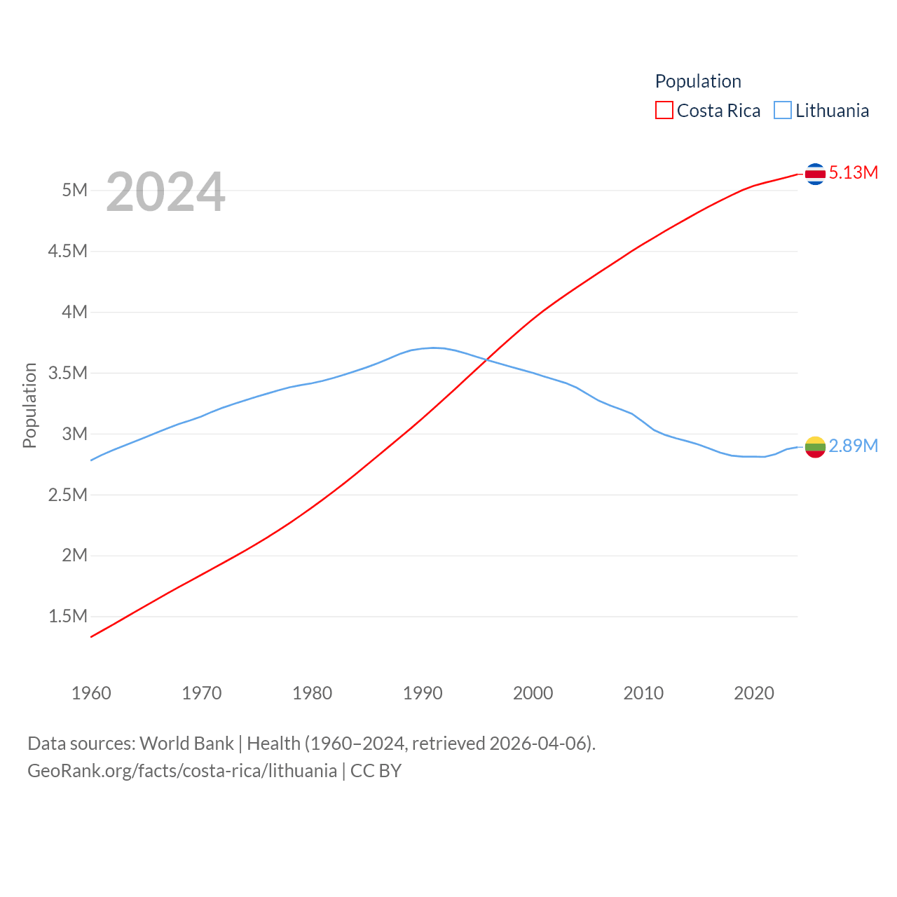 Costa Rica has a population of 5.13M (ranked 126/197), compared with 2.89M in Lithuania (ranked 137/197). Costa Rica's land area is 19,714 sq mi versus 24,170 sq mi for Lithuania (ranked 126th vs. 120th).