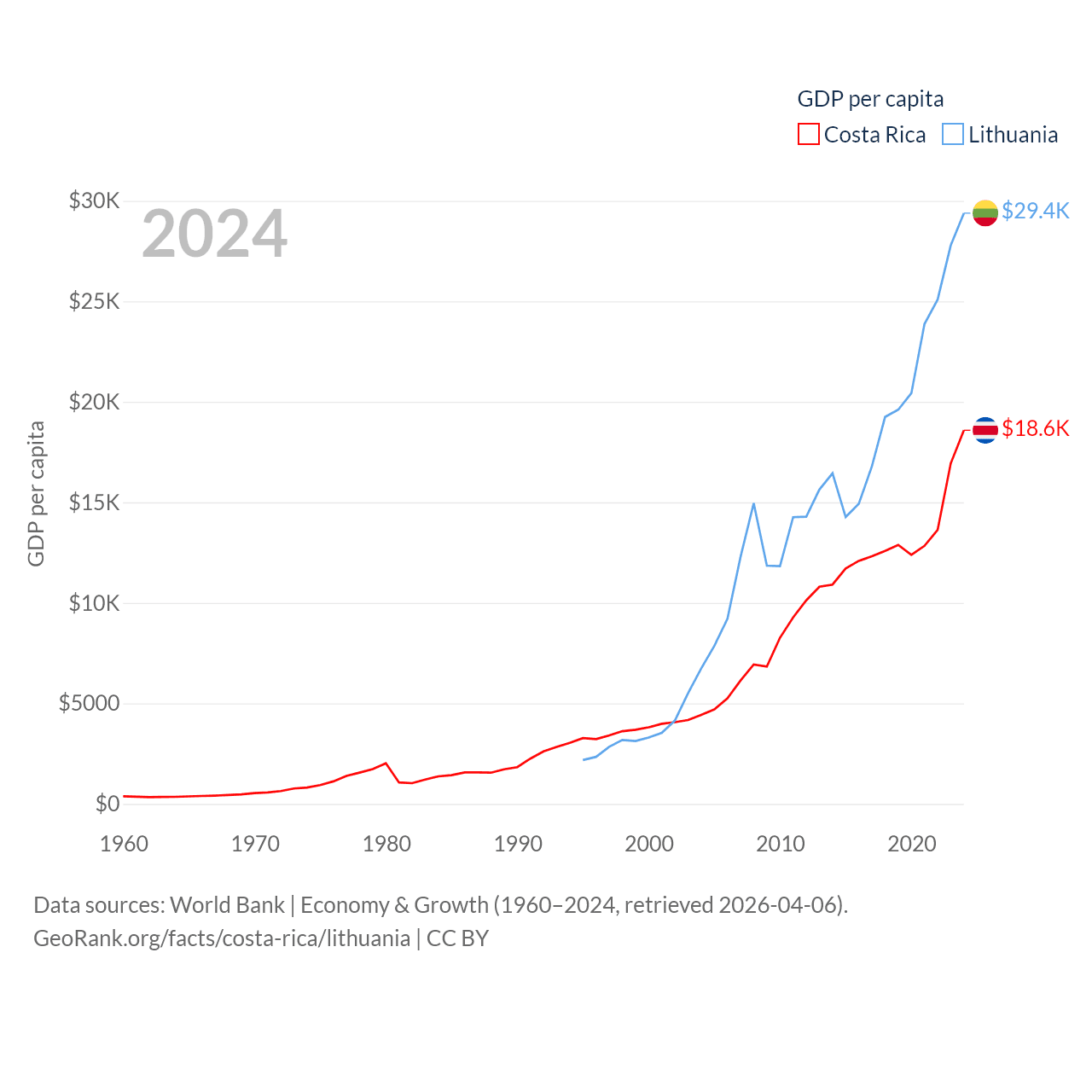 By GDP, Costa Rica ranks 73/197 ($95.4B) and Lithuania ranks 79/197 ($84.9B). By GDP per capita, Costa Rica ranks 62/197 ($18,587), while Lithuania ranks 43/197 ($29,384).