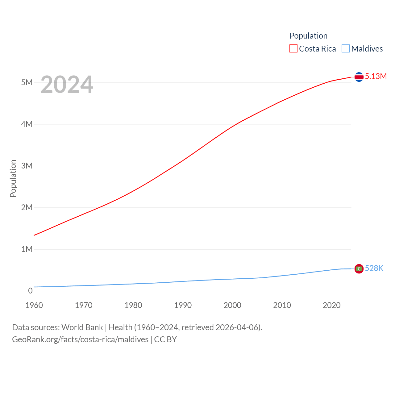 Costa Rica has a population of 5.13M (ranked 126/197), compared with 528K in Maldives (ranked 168/197). Costa Rica's land area is 19,714 sq mi versus 115.1 sq mi for Maldives (ranked 126th vs. 188th).