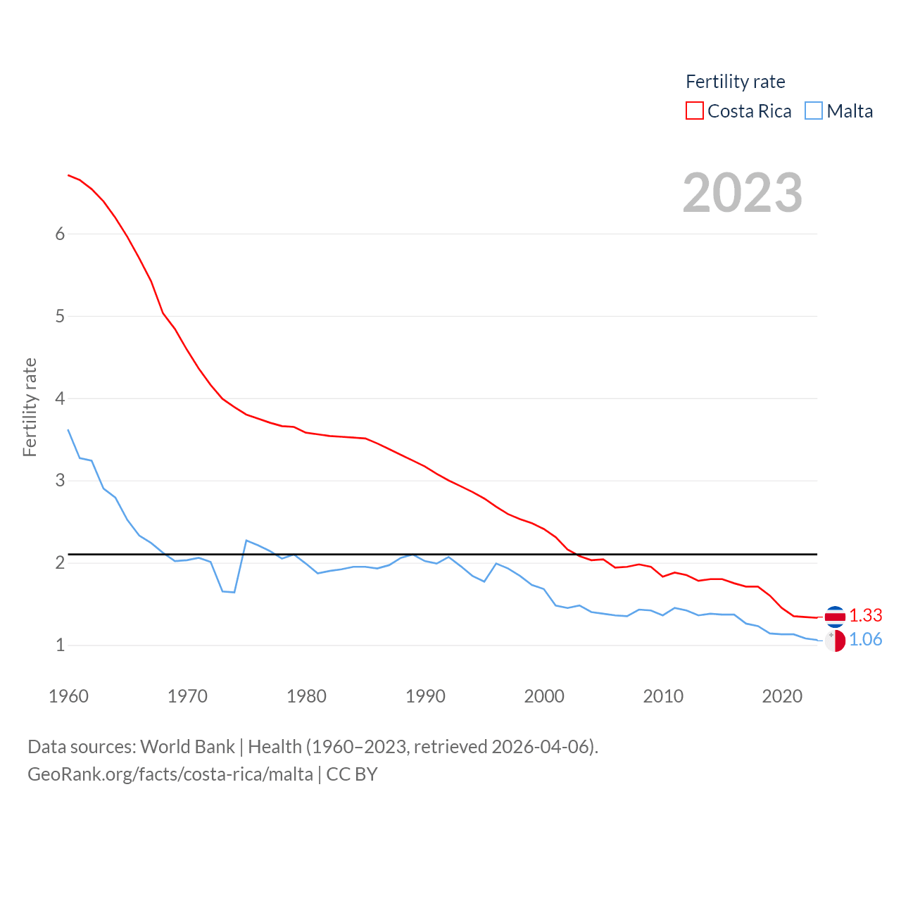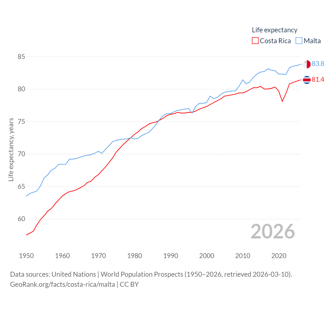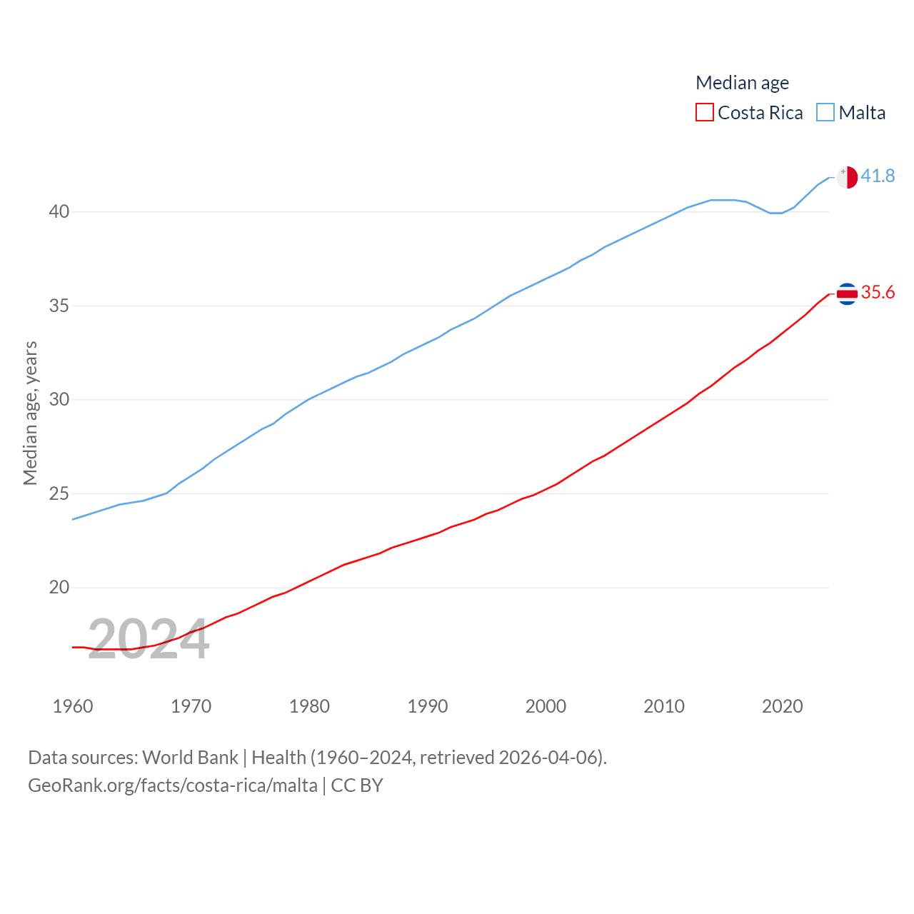 Costa Rica has a population of 5.13M (ranked 126/197), compared with 569K in Malta (ranked 167/197). Costa Rica's land area is 19,714 sq mi versus 123.6 sq mi for Malta (ranked 126th vs. 187th).