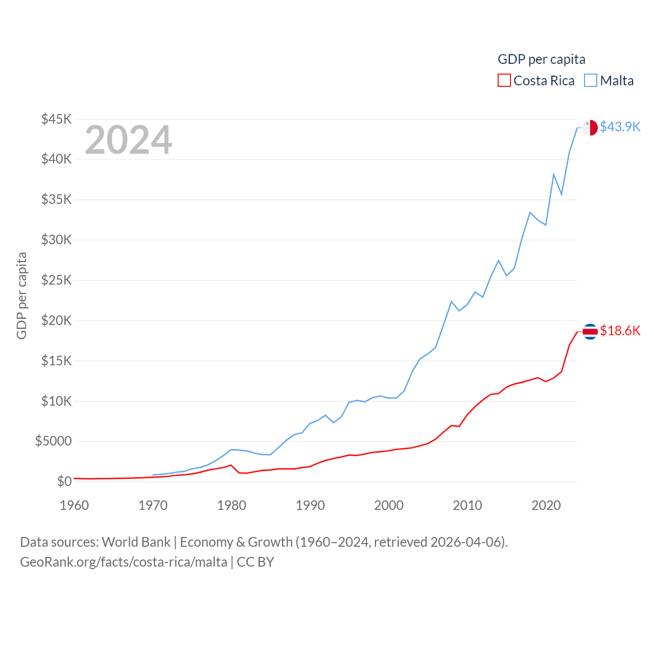 By GDP, Costa Rica ranks 73/197 ($95.4B) and Malta ranks 119/197 ($25B). By GDP per capita, Costa Rica ranks 62/197 ($18,587), while Malta ranks 28/197 ($43,899).
