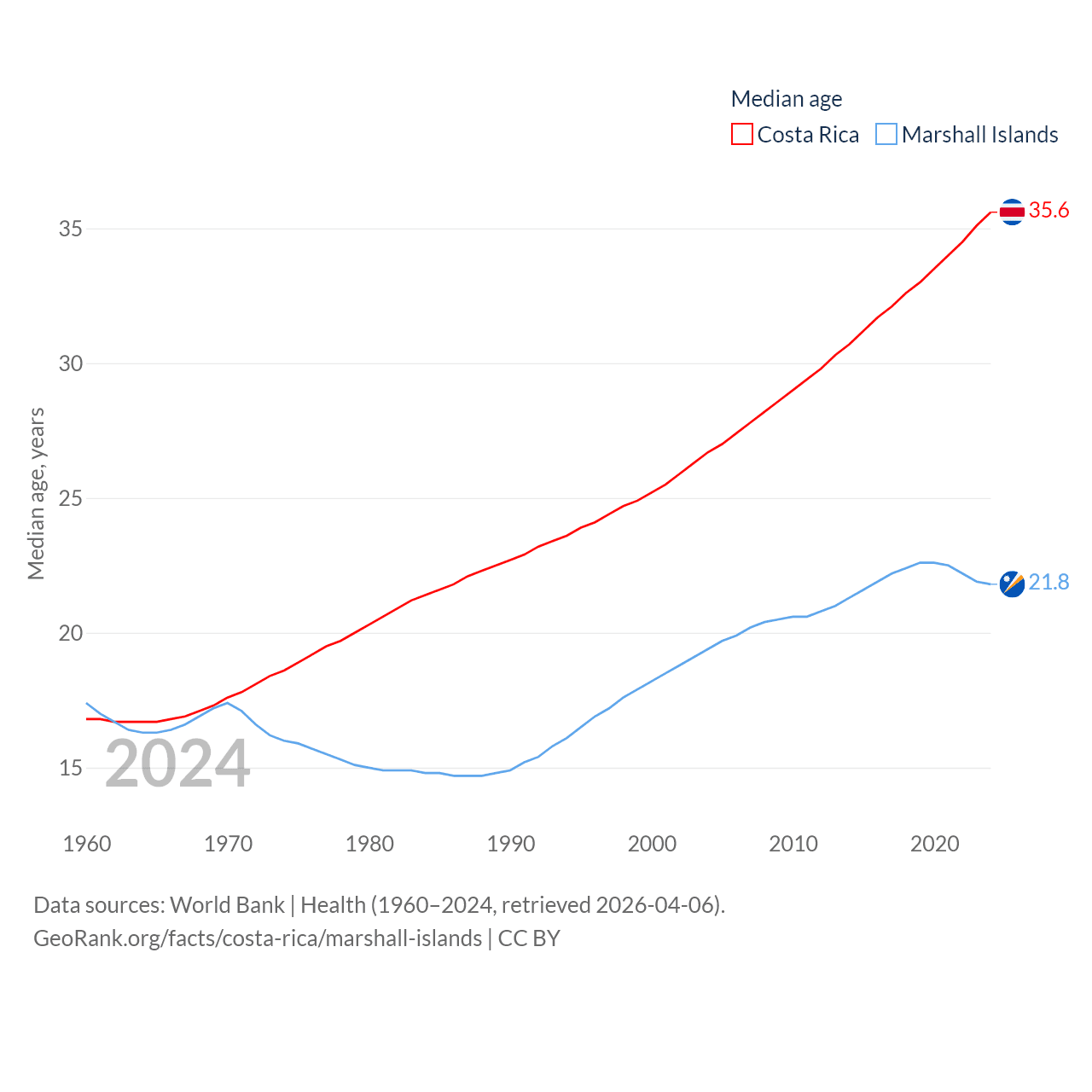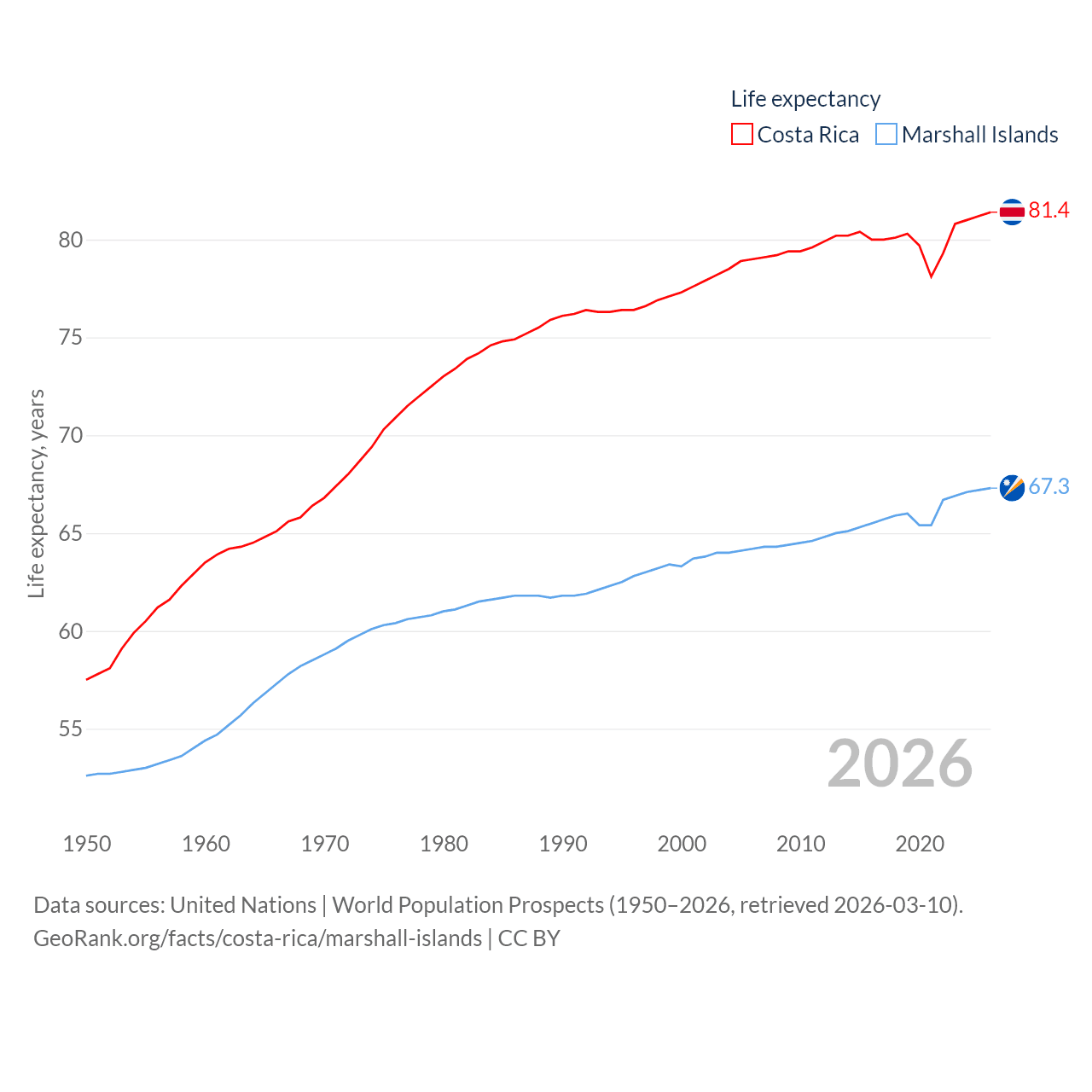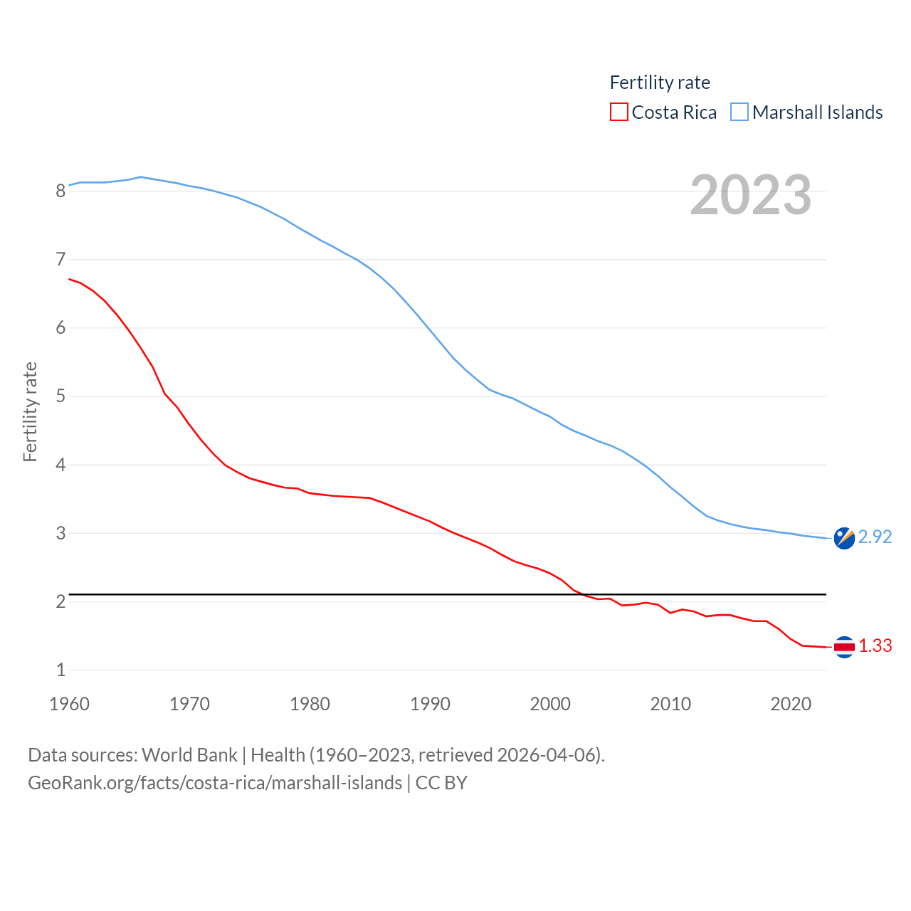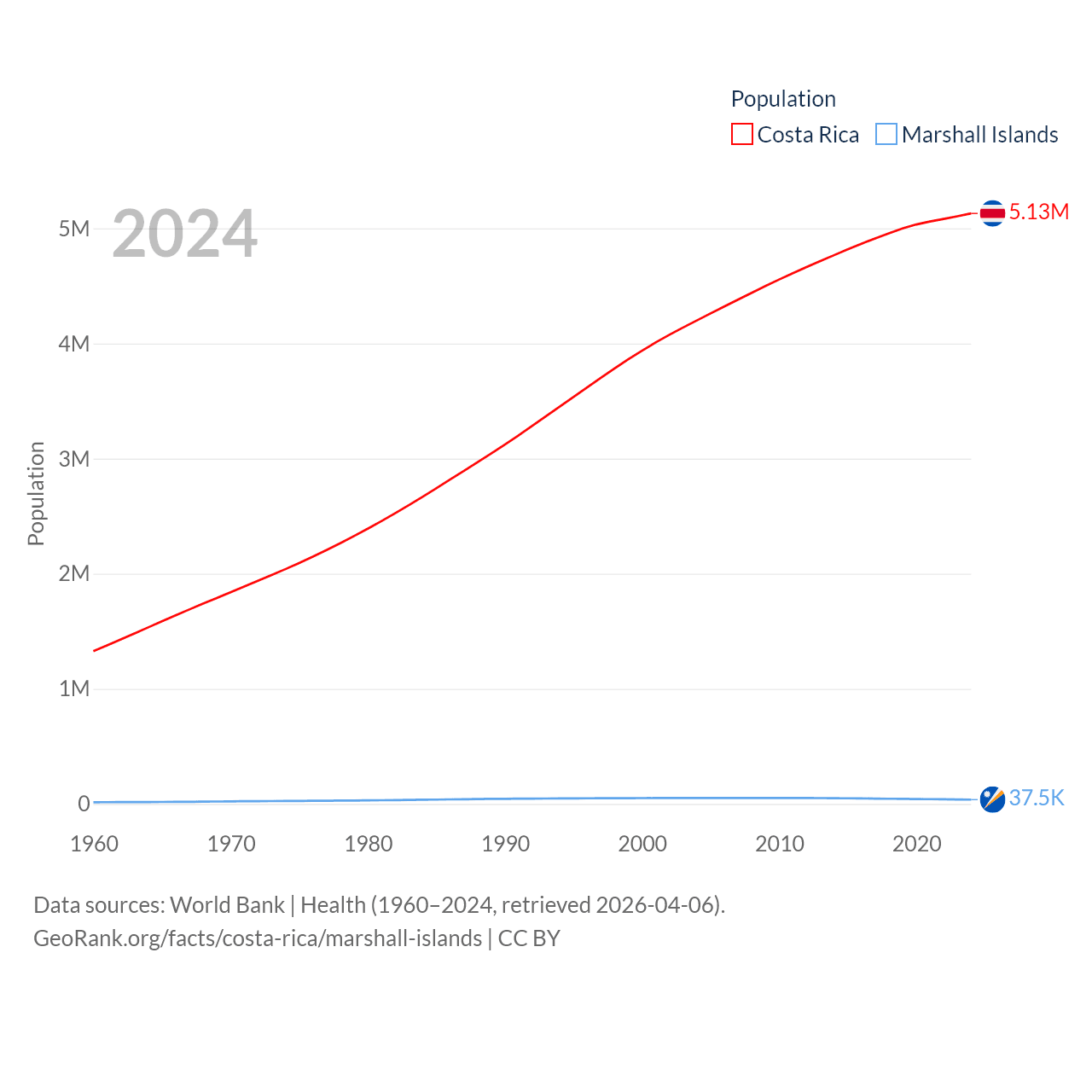 Costa Rica has a population of 5.13M (ranked 126/197), compared with 37.5K in The Marshall Islands (ranked 192/197). Costa Rica's land area is 19,714 sq mi versus 69.5 sq mi for The Marshall Islands (ranked 126th vs. 191st).