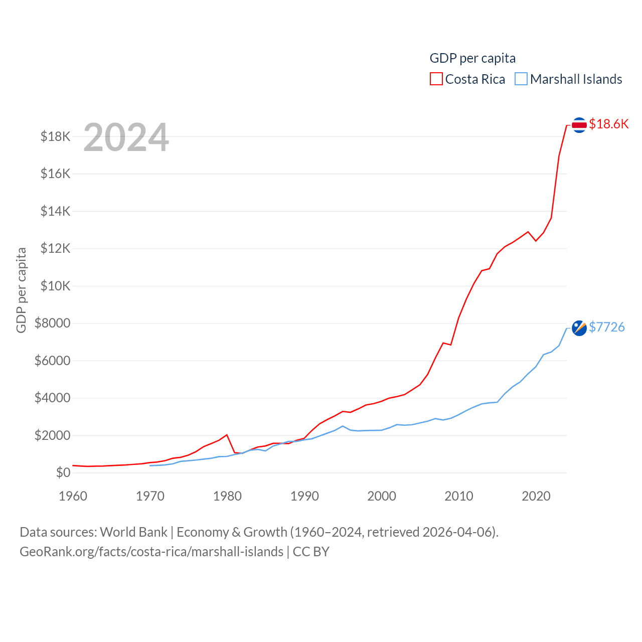 By GDP, Costa Rica ranks 73/197 ($95.4B) and The Marshall Islands ranks 193/197 ($290M). By GDP per capita, Costa Rica ranks 62/197 ($18,587), while The Marshall Islands ranks 96/197 ($7,726).