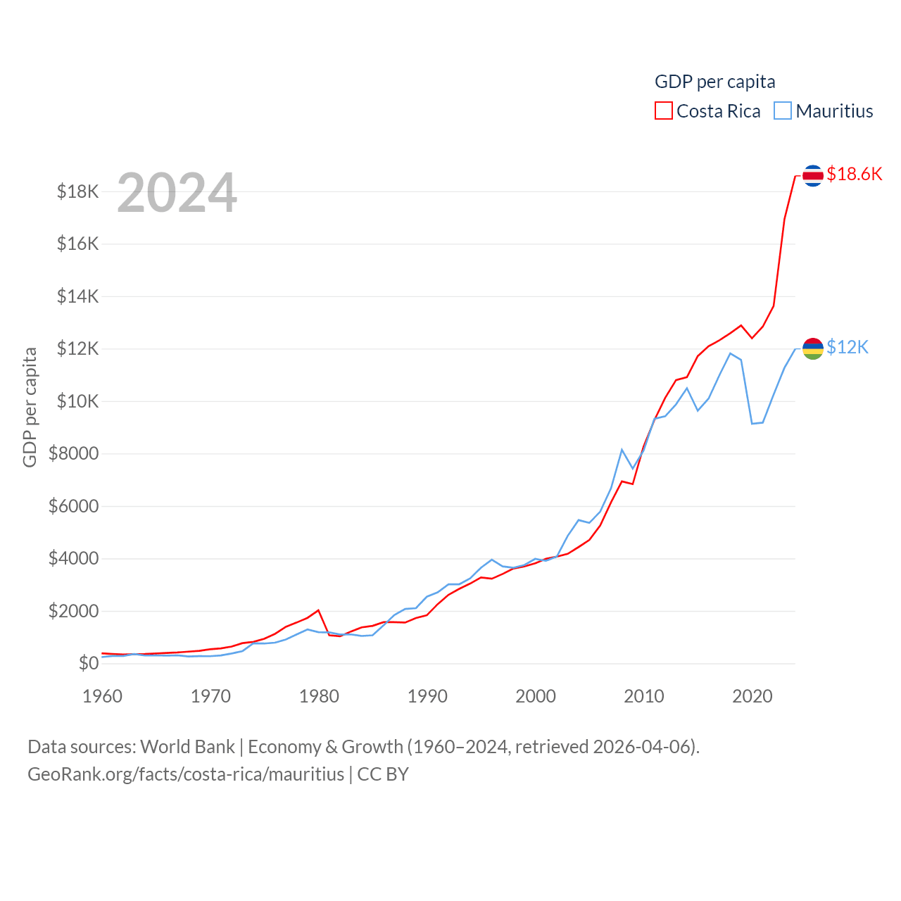 By GDP, Costa Rica ranks 73/197 ($95.4B) and Mauritius ranks 143/197 ($14.9B). By GDP per capita, Costa Rica ranks 62/197 ($18,587), while Mauritius ranks 78/197 ($11,991).
