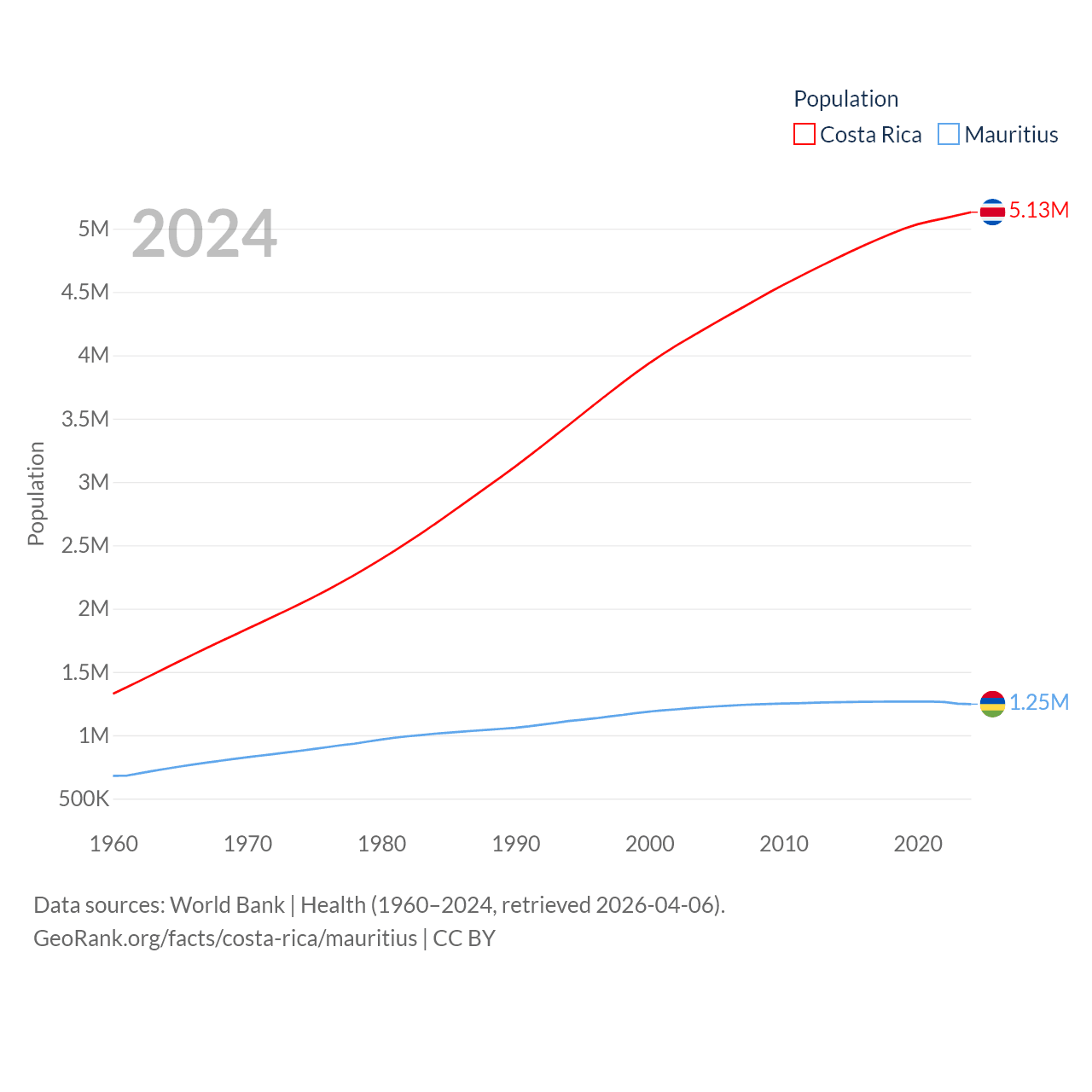 Costa Rica has a population of 5.13M (ranked 126/197), compared with 1.25M in Mauritius (ranked 156/197). Costa Rica's land area is 19,714 sq mi versus 771 sq mi for Mauritius (ranked 126th vs. 170th).