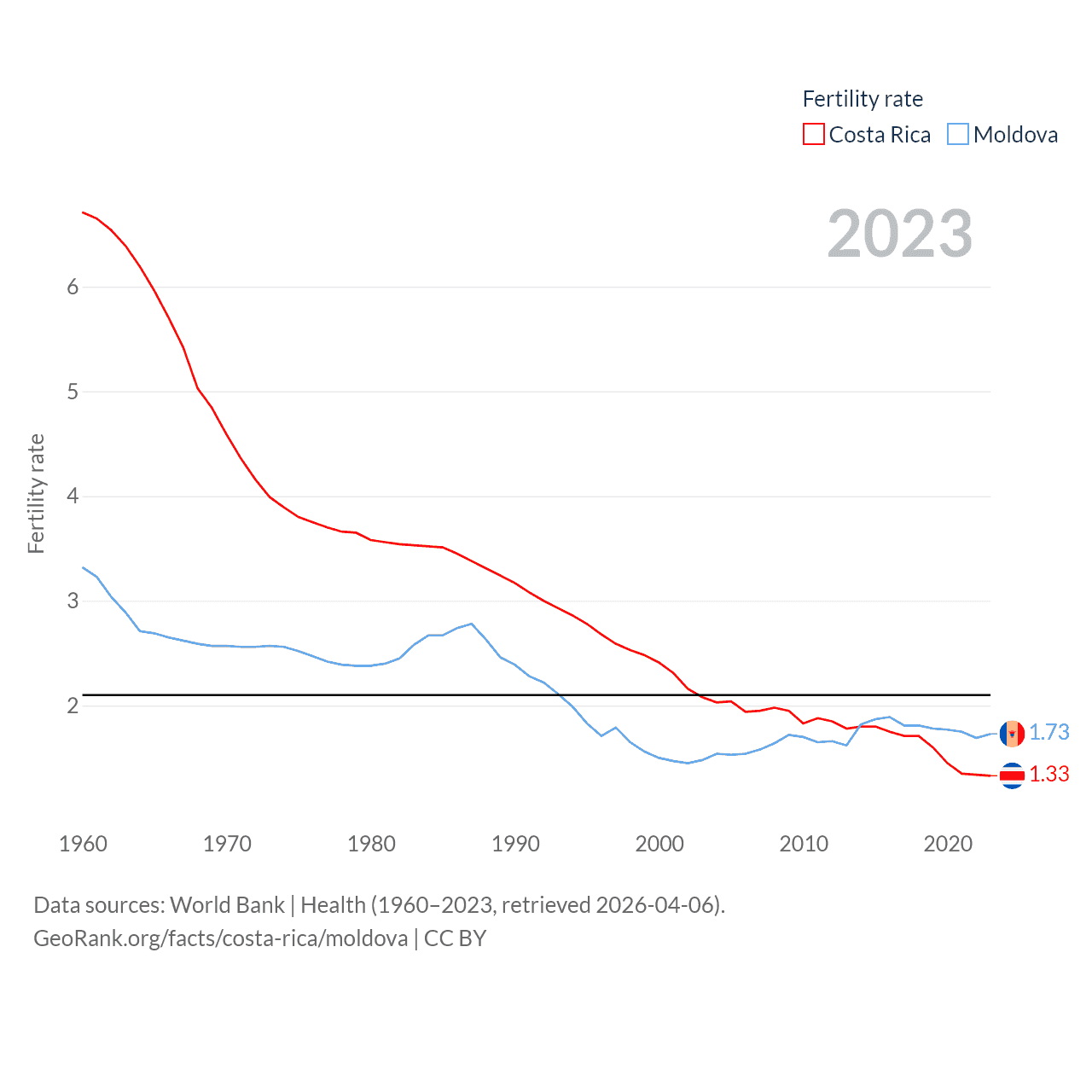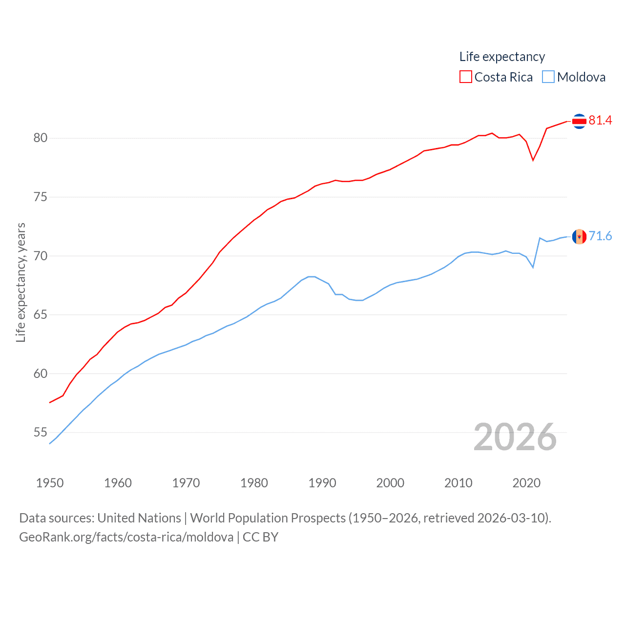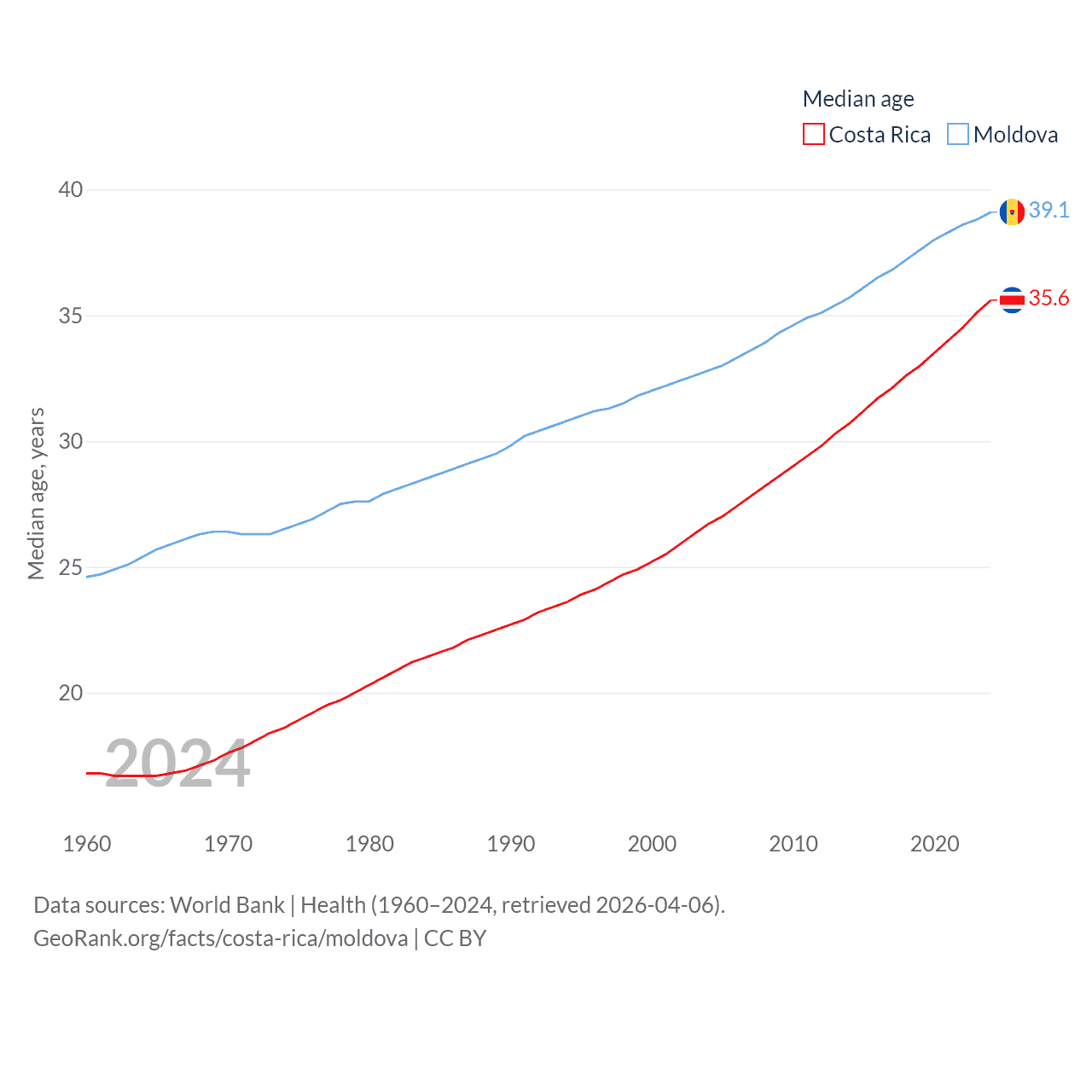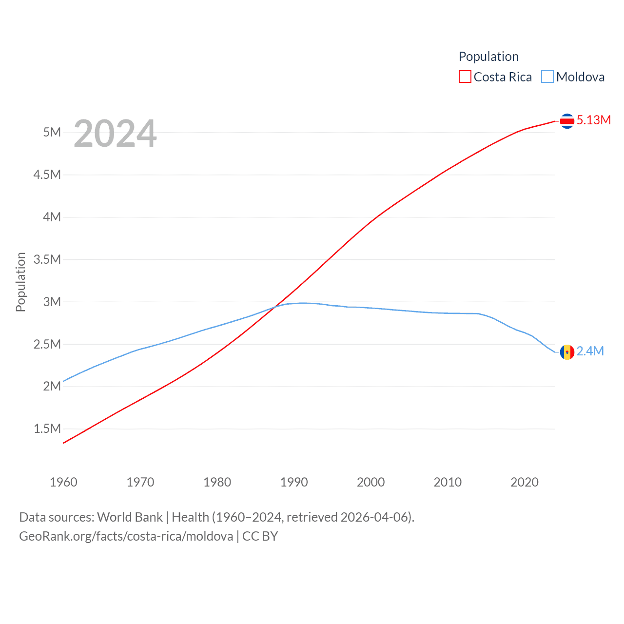 Costa Rica has a population of 5.13M (ranked 126/197), compared with 2.4M in Moldova (ranked 143/197). Costa Rica's land area is 19,714 sq mi versus 12,714 sq mi for Moldova (ranked 126th vs. 135th).