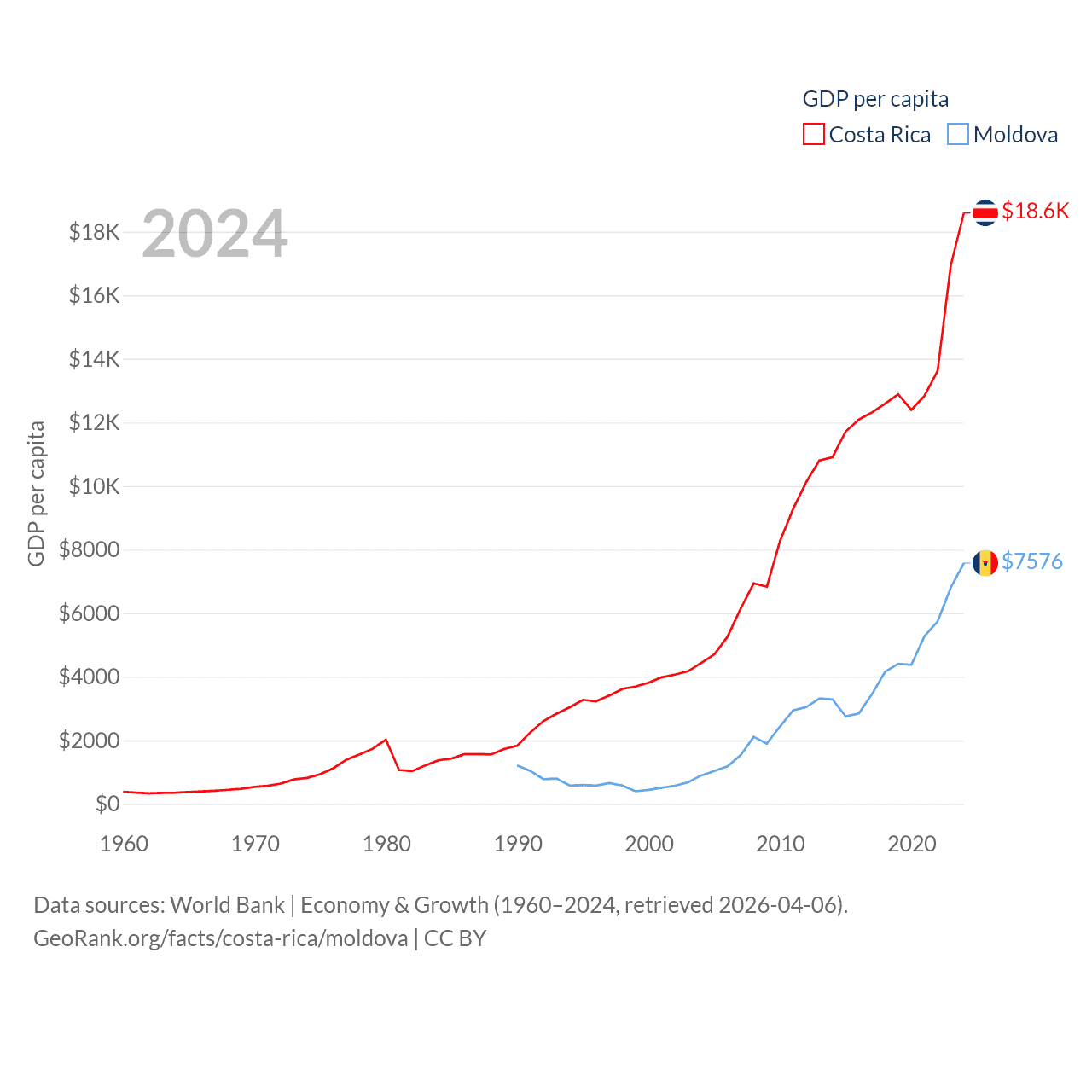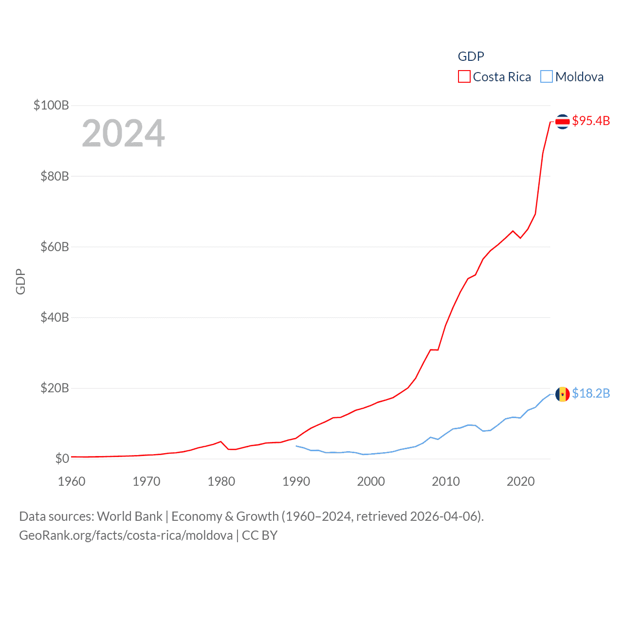 By GDP, Costa Rica ranks 73/197 ($95.4B) and Moldova ranks 134/197 ($18.2B). By GDP per capita, Costa Rica ranks 62/197 ($18,587), while Moldova ranks 99/197 ($7,576).