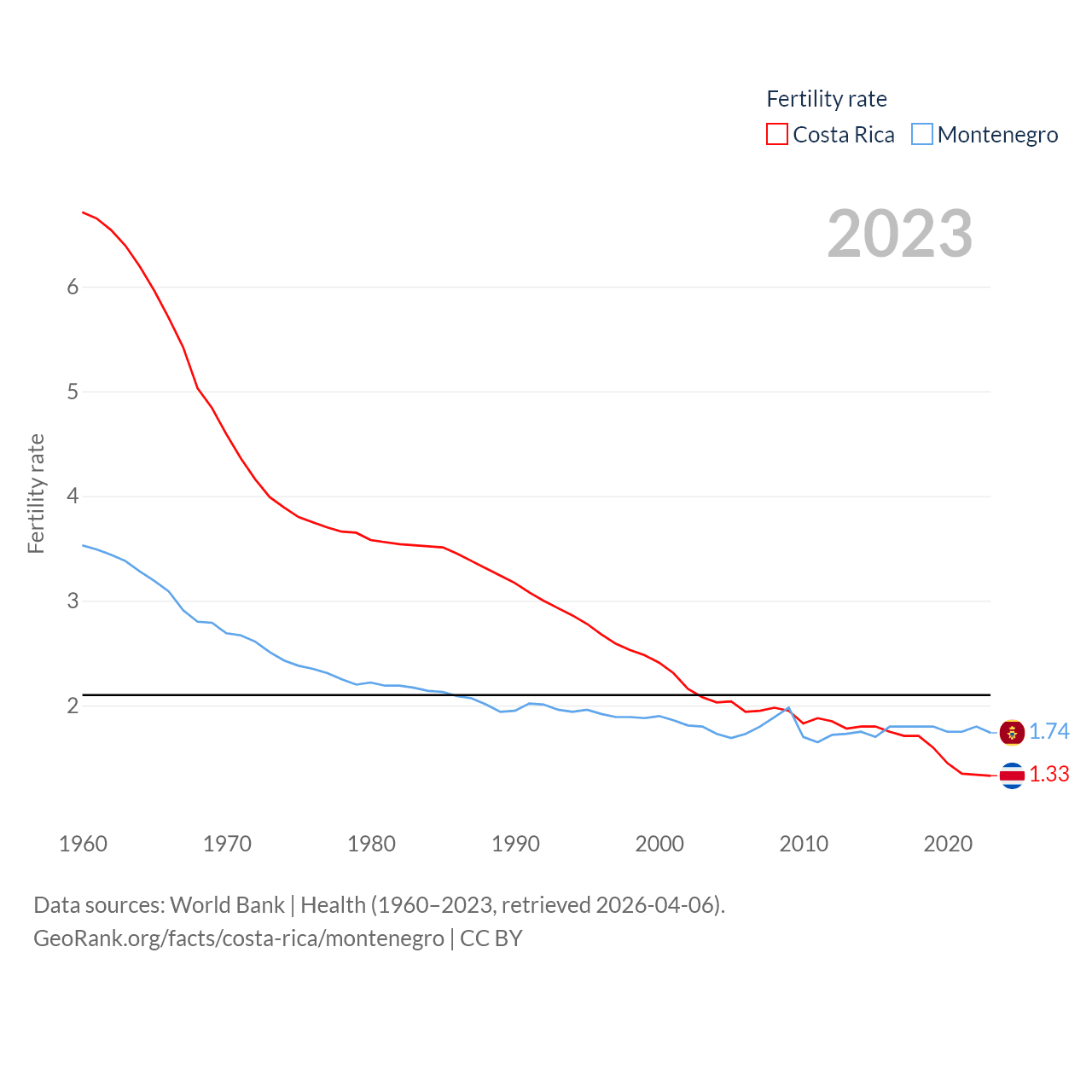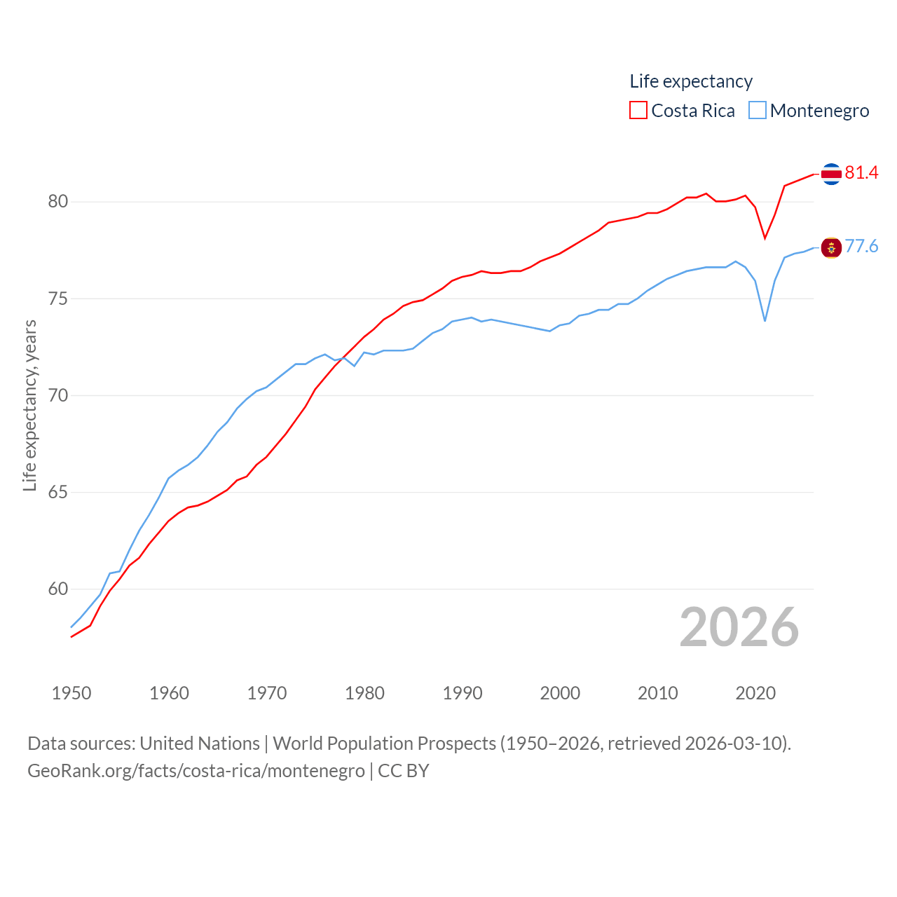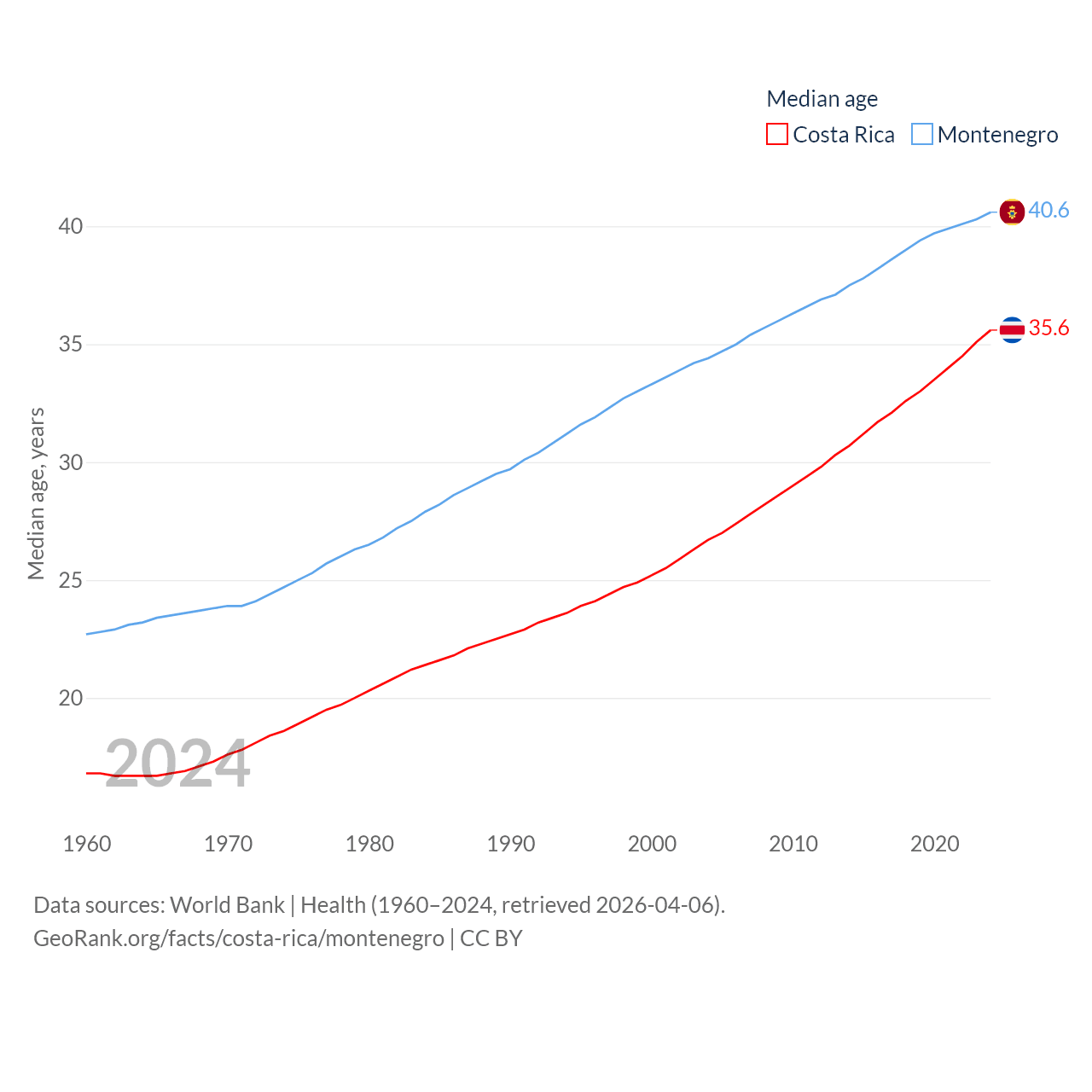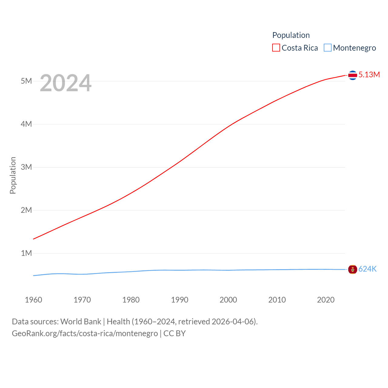 Costa Rica has a population of 5.13M (ranked 126/197), compared with 624K in Montenegro (ranked 166/197). Costa Rica's land area is 19,714 sq mi versus 5,193 sq mi for Montenegro (ranked 126th vs. 156th).