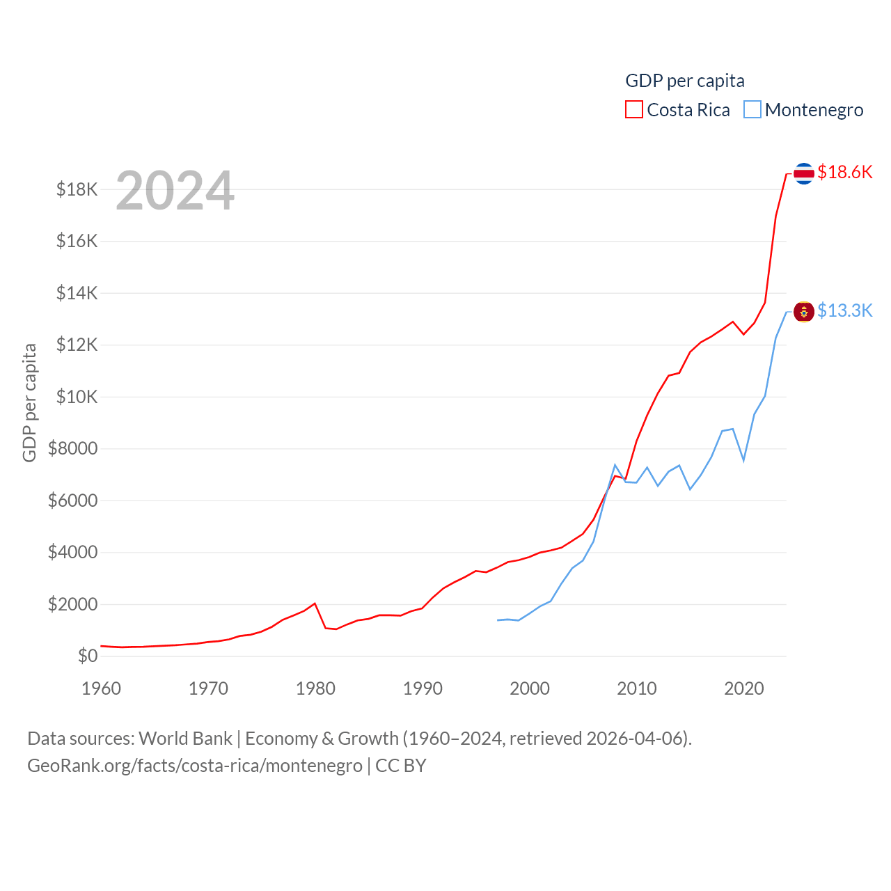 By GDP, Costa Rica ranks 73/197 ($95.4B) and Montenegro ranks 155/197 ($8.27B). By GDP per capita, Costa Rica ranks 62/197 ($18,587), while Montenegro ranks 77/197 ($13,263).