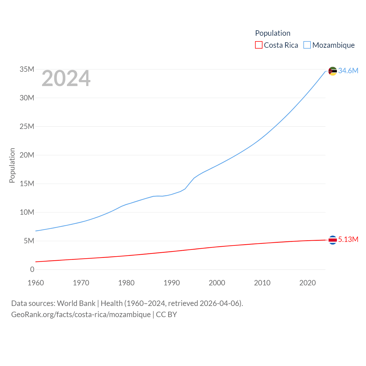 Costa Rica has a population of 5.13M (ranked 126/197), compared with 34.6M in Mozambique (ranked 46/197). Costa Rica's land area is 19,714 sq mi versus 303,623 sq mi for Mozambique (ranked 126th vs. 34th).