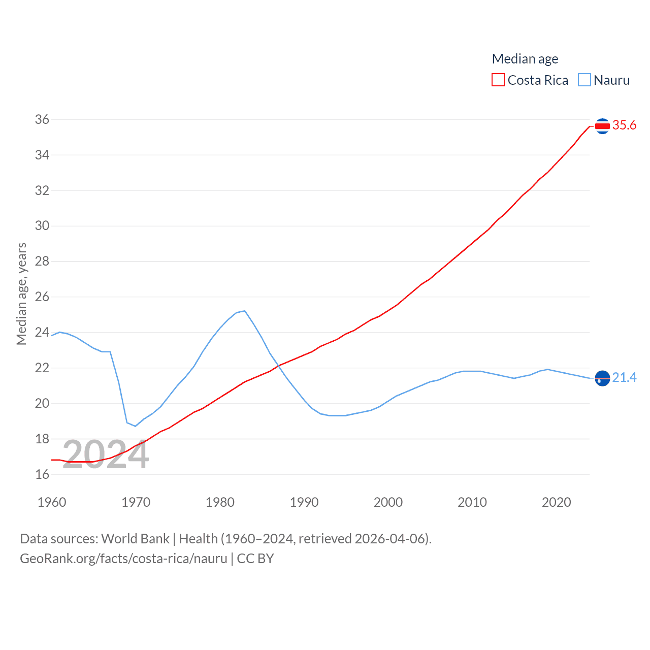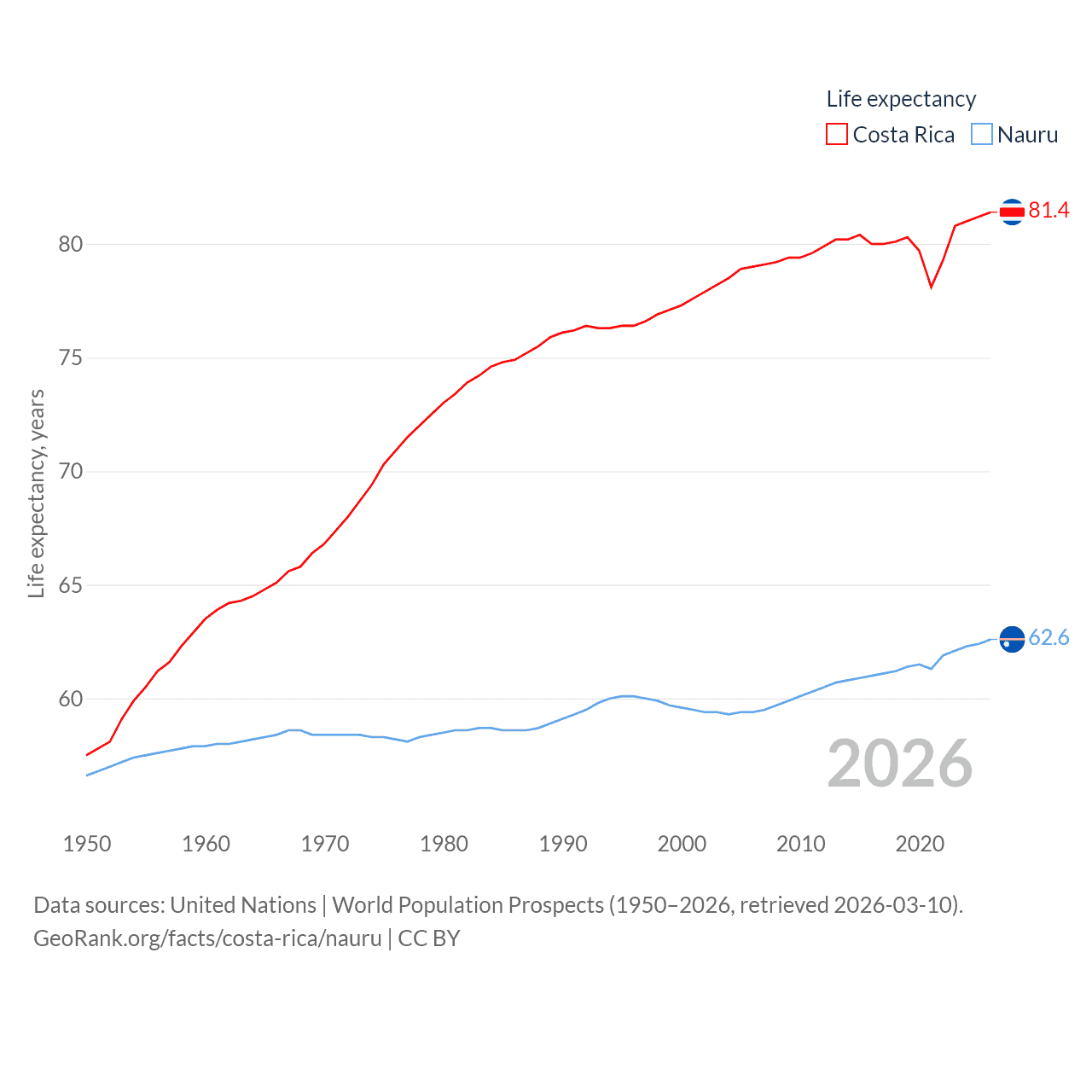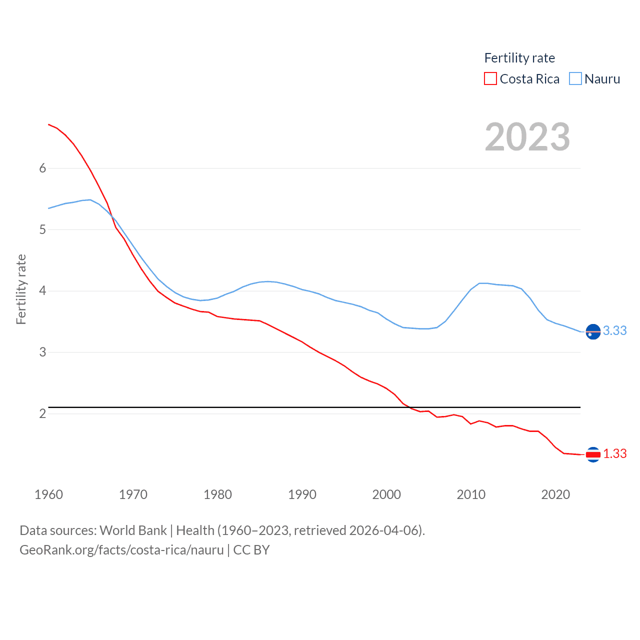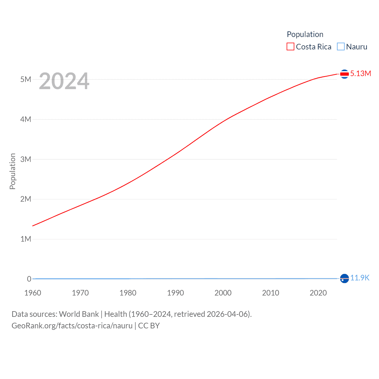 Costa Rica has a population of 5.13M (ranked 126/197), compared with 11.9K in Nauru (ranked 195/197). Costa Rica's land area is 19,714 sq mi versus 7.72 sq mi for Nauru (ranked 126th vs. 195th).