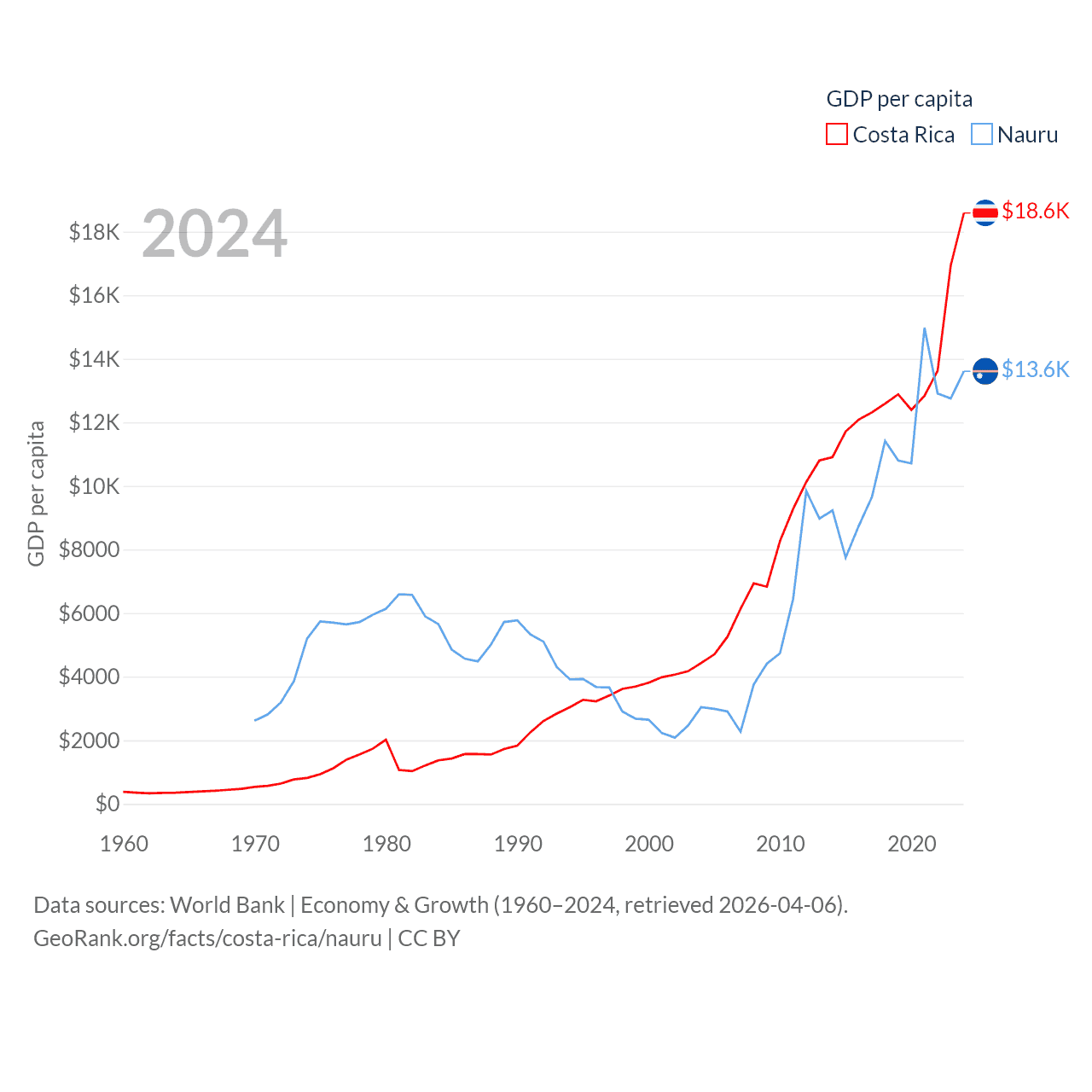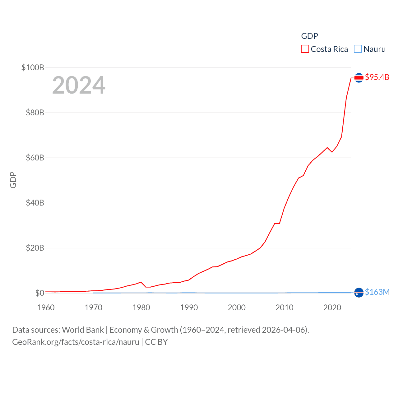 By GDP, Costa Rica ranks 73/197 ($95.4B) and Nauru ranks 195/197 ($163M). By GDP per capita, Costa Rica ranks 62/197 ($18,587), while Nauru ranks 74/197 ($13,609).