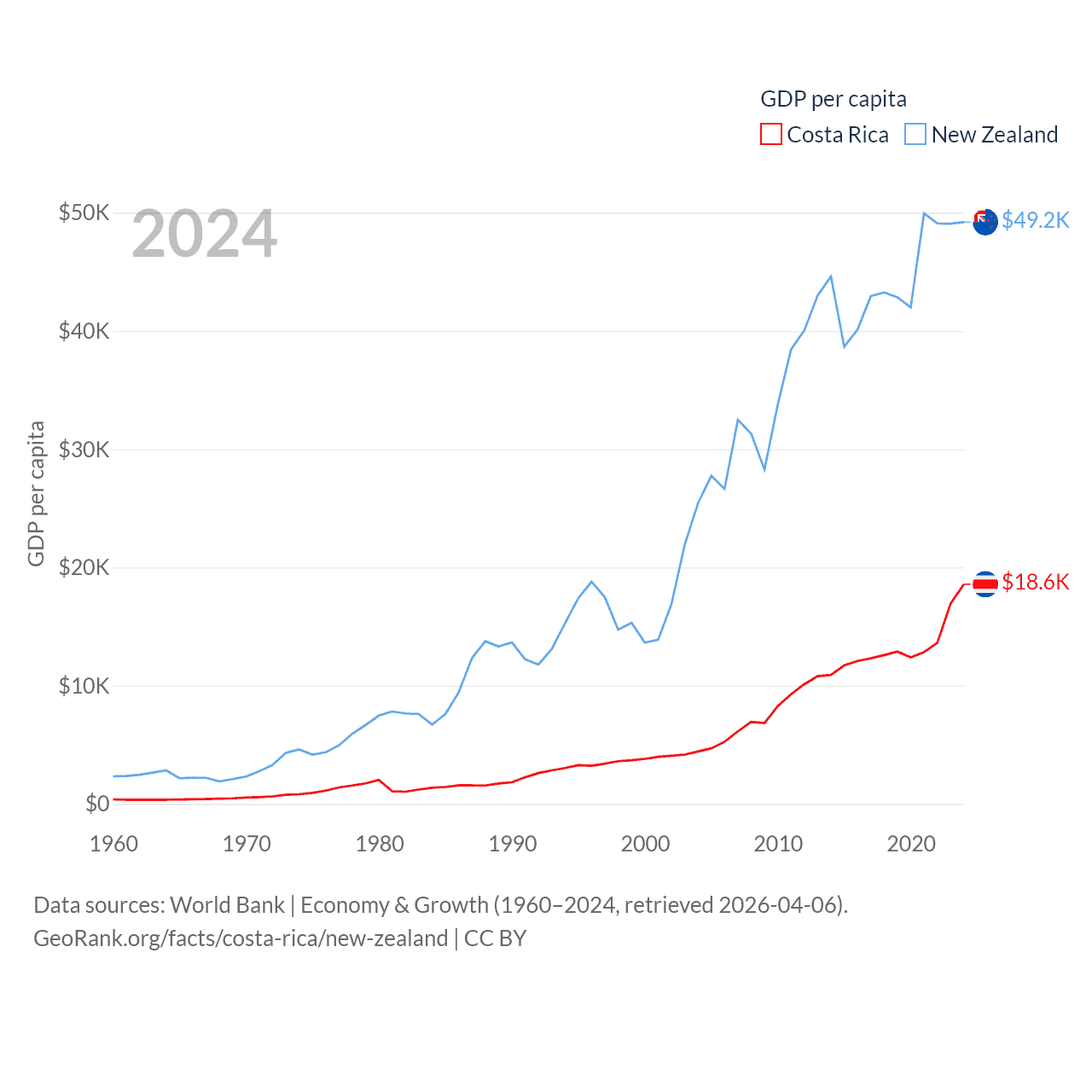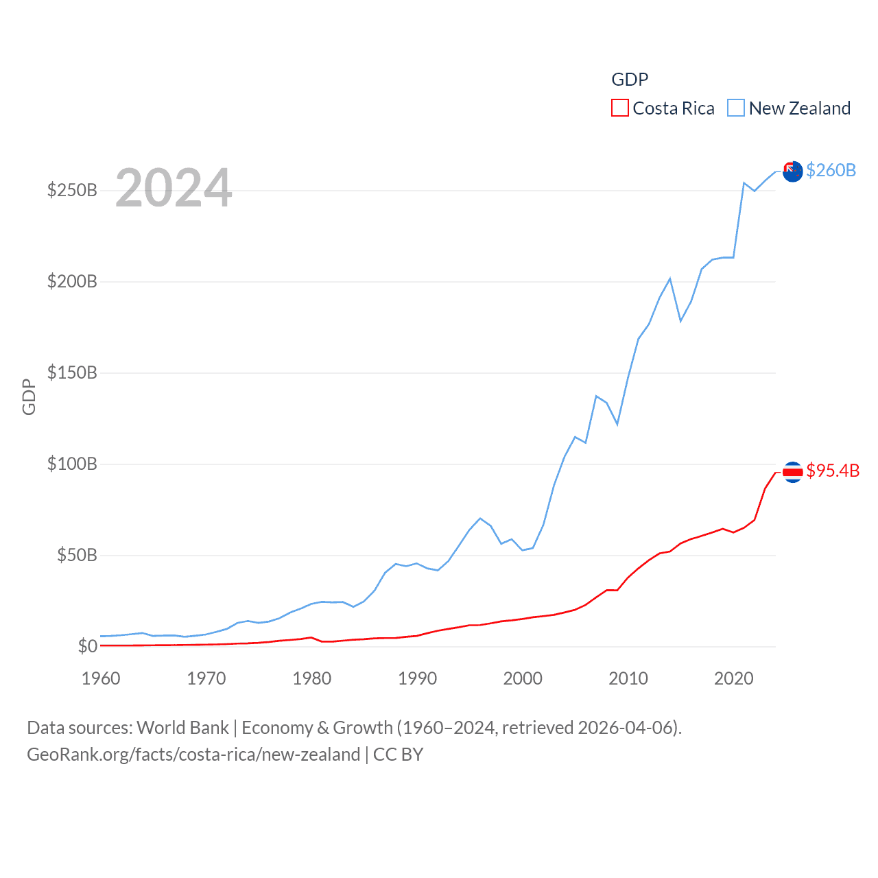 By GDP, Costa Rica ranks 73/197 ($95.4B) and New Zealand ranks 52/197 ($260B). By GDP per capita, Costa Rica ranks 62/197 ($18,587), while New Zealand ranks 26/197 ($49,205).