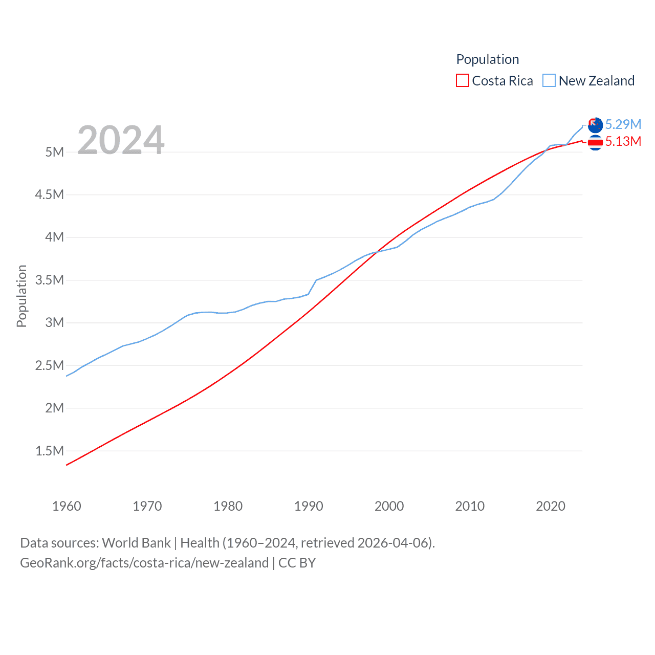 Costa Rica has a population of 5.13M (ranked 126/197), compared with 5.29M in New Zealand (ranked 123/197). Costa Rica's land area is 19,714 sq mi versus 101,665 sq mi for New Zealand (ranked 126th vs. 74th).