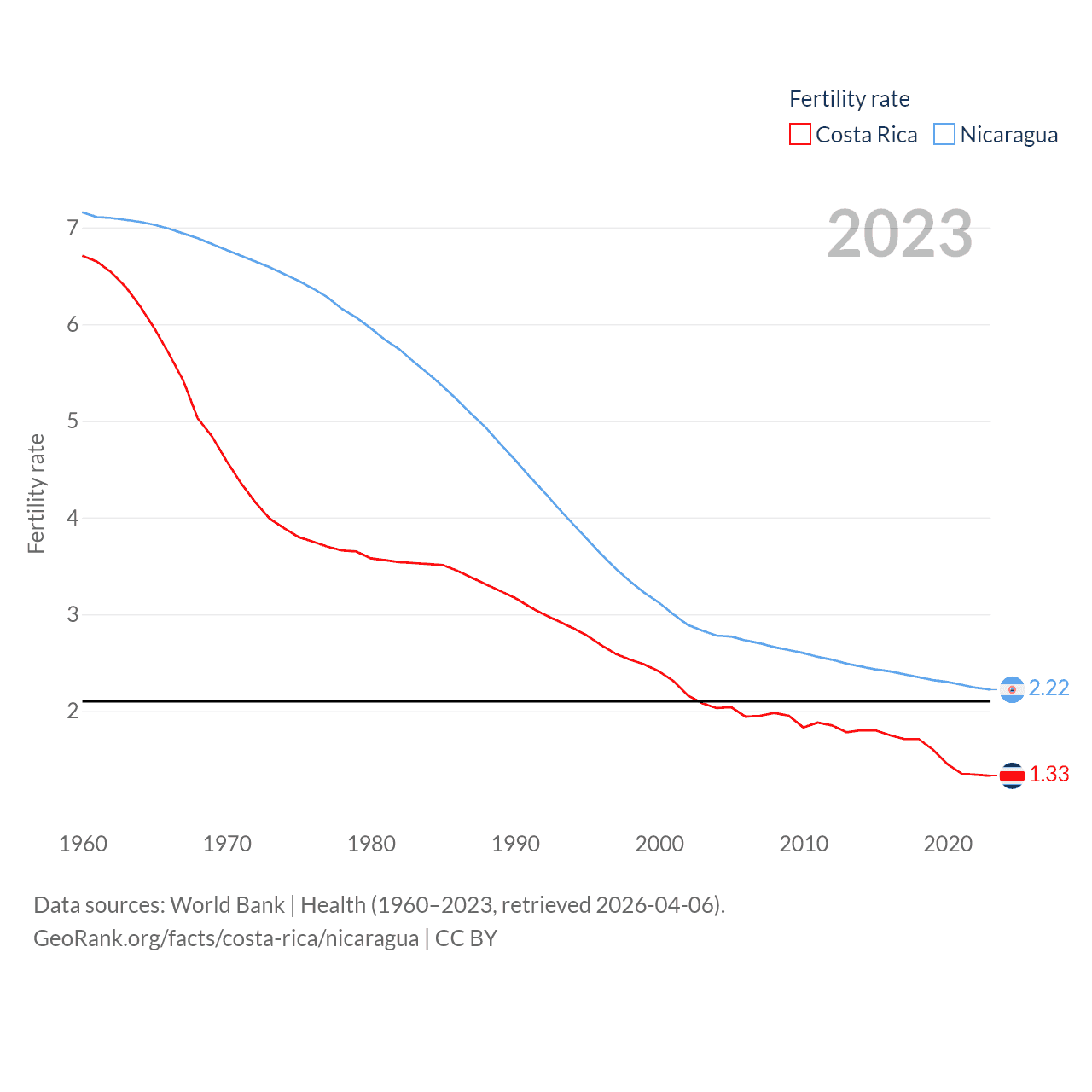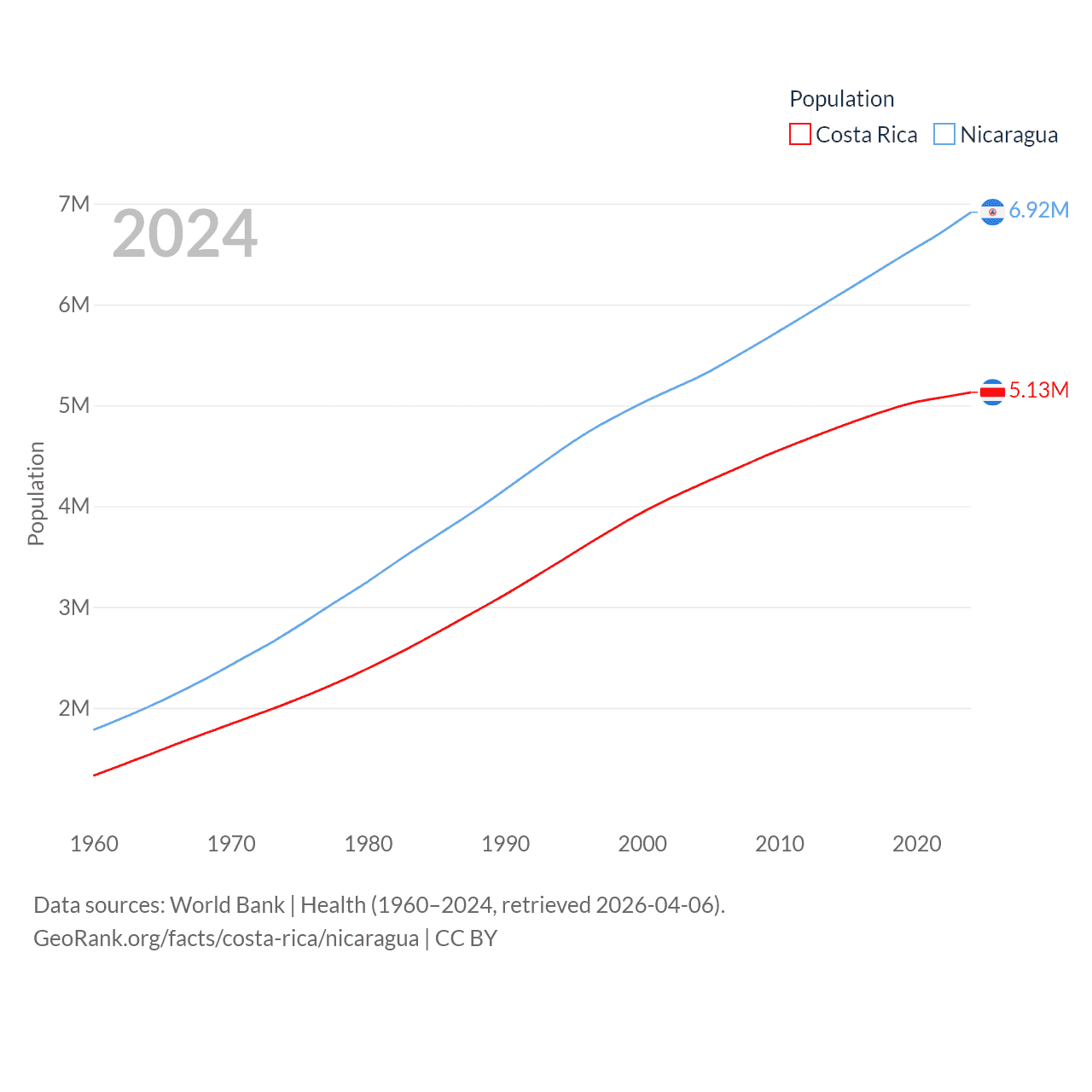 Costa Rica has a population of 5.13M (ranked 126/197), compared with 6.92M in Nicaragua (ranked 108/197). Costa Rica's land area is 19,714 sq mi versus 46,464 sq mi for Nicaragua (ranked 126th vs. 98th).