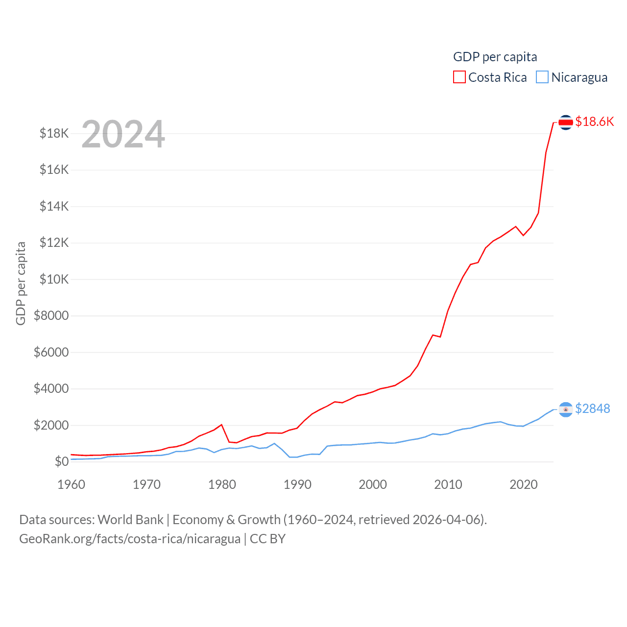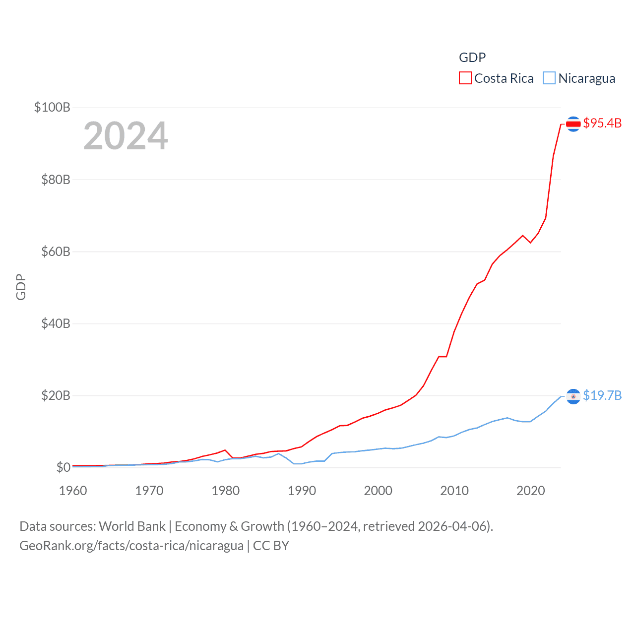 By GDP, Costa Rica ranks 73/197 ($95.4B) and Nicaragua ranks 131/197 ($19.7B). By GDP per capita, Costa Rica ranks 62/197 ($18,587), while Nicaragua ranks 141/197 ($2,848).