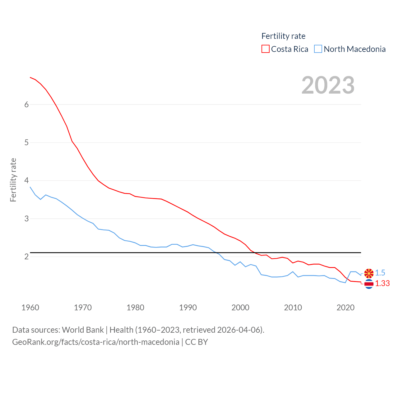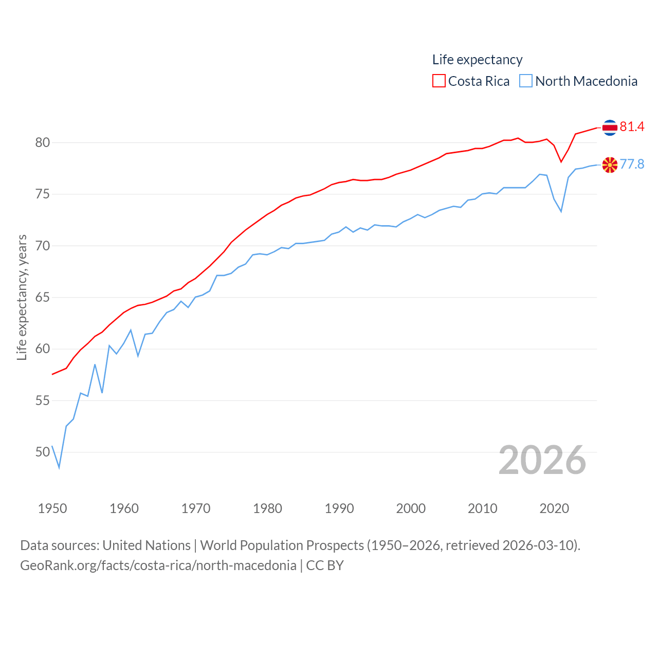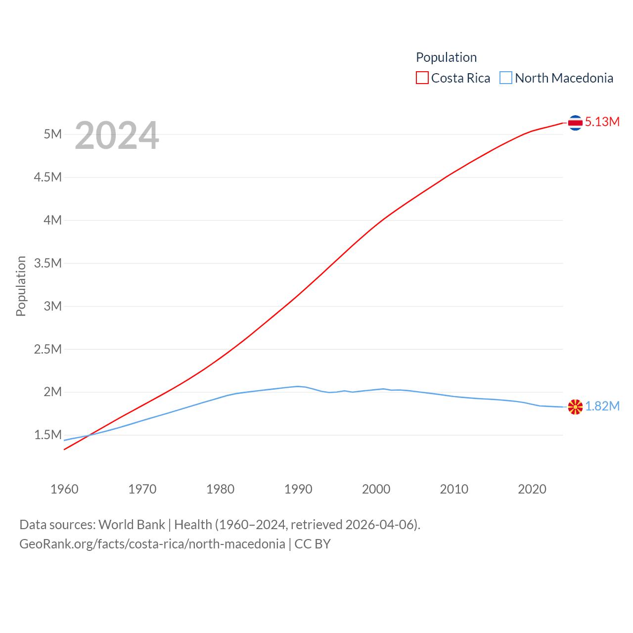 Costa Rica has a population of 5.13M (ranked 126/197), compared with 1.82M in North Macedonia (ranked 150/197). Costa Rica's land area is 19,714 sq mi versus 9,737 sq mi for North Macedonia (ranked 126th vs. 145th).