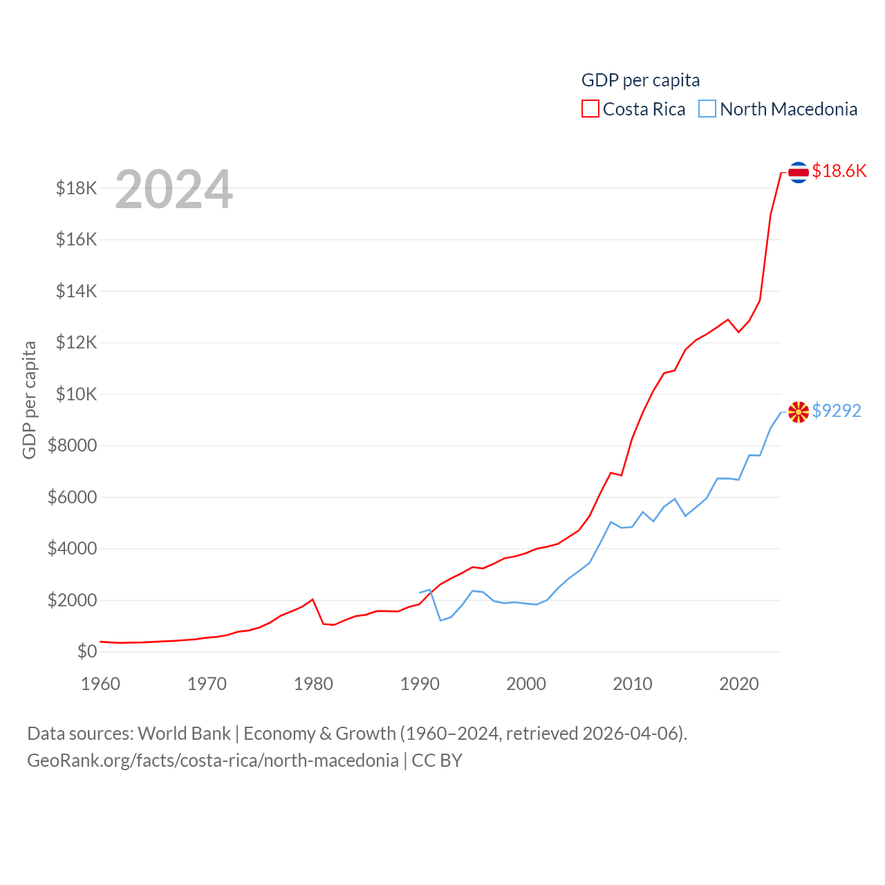 By GDP, Costa Rica ranks 73/197 ($95.4B) and North Macedonia ranks 138/197 ($17B). By GDP per capita, Costa Rica ranks 62/197 ($18,587), while North Macedonia ranks 88/197 ($9,292).