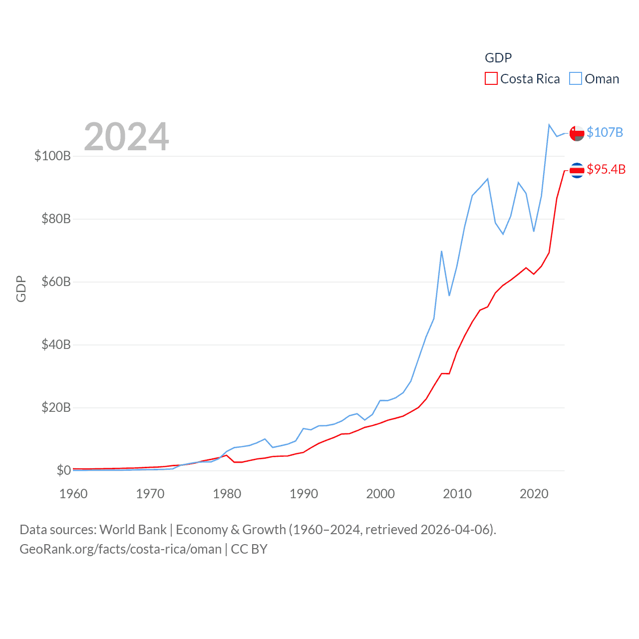 By GDP, Costa Rica ranks 73/197 ($95.4B) and Oman ranks 70/197 ($107B). By GDP per capita, Costa Rica ranks 62/197 ($18,587), while Oman ranks 57/197 ($20,285).