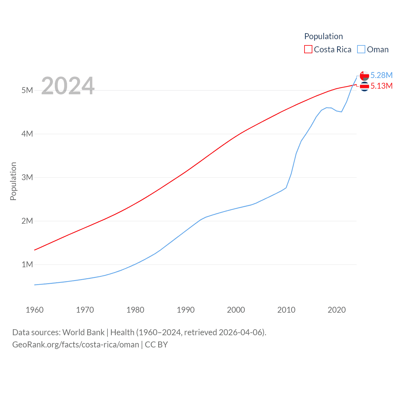 Costa Rica has a population of 5.13M (ranked 126/197), compared with 5.28M in Oman (ranked 124/197). Costa Rica's land area is 19,714 sq mi versus 119,499 sq mi for Oman (ranked 126th vs. 68th).