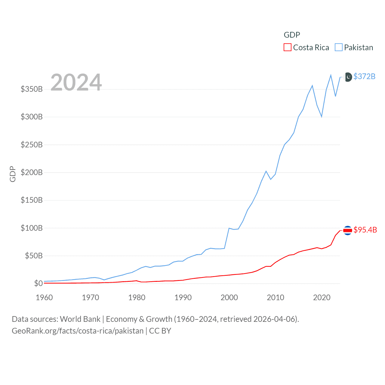 By GDP, Costa Rica ranks 73/197 ($95.4B) and Pakistan ranks 43/197 ($372B). By GDP per capita, Costa Rica ranks 62/197 ($18,587), while Pakistan ranks 163/197 ($1,479).