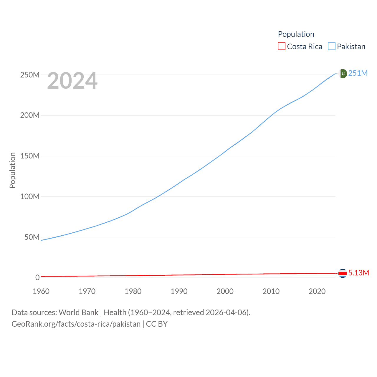 Costa Rica has a population of 5.13M (ranked 126/197), compared with 251M in Pakistan (ranked 5/197). Costa Rica's land area is 19,714 sq mi versus 297,638 sq mi for Pakistan (ranked 126th vs. 35th).