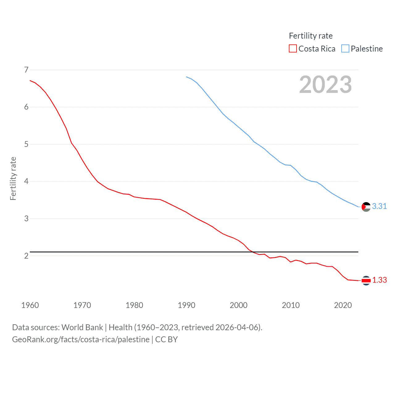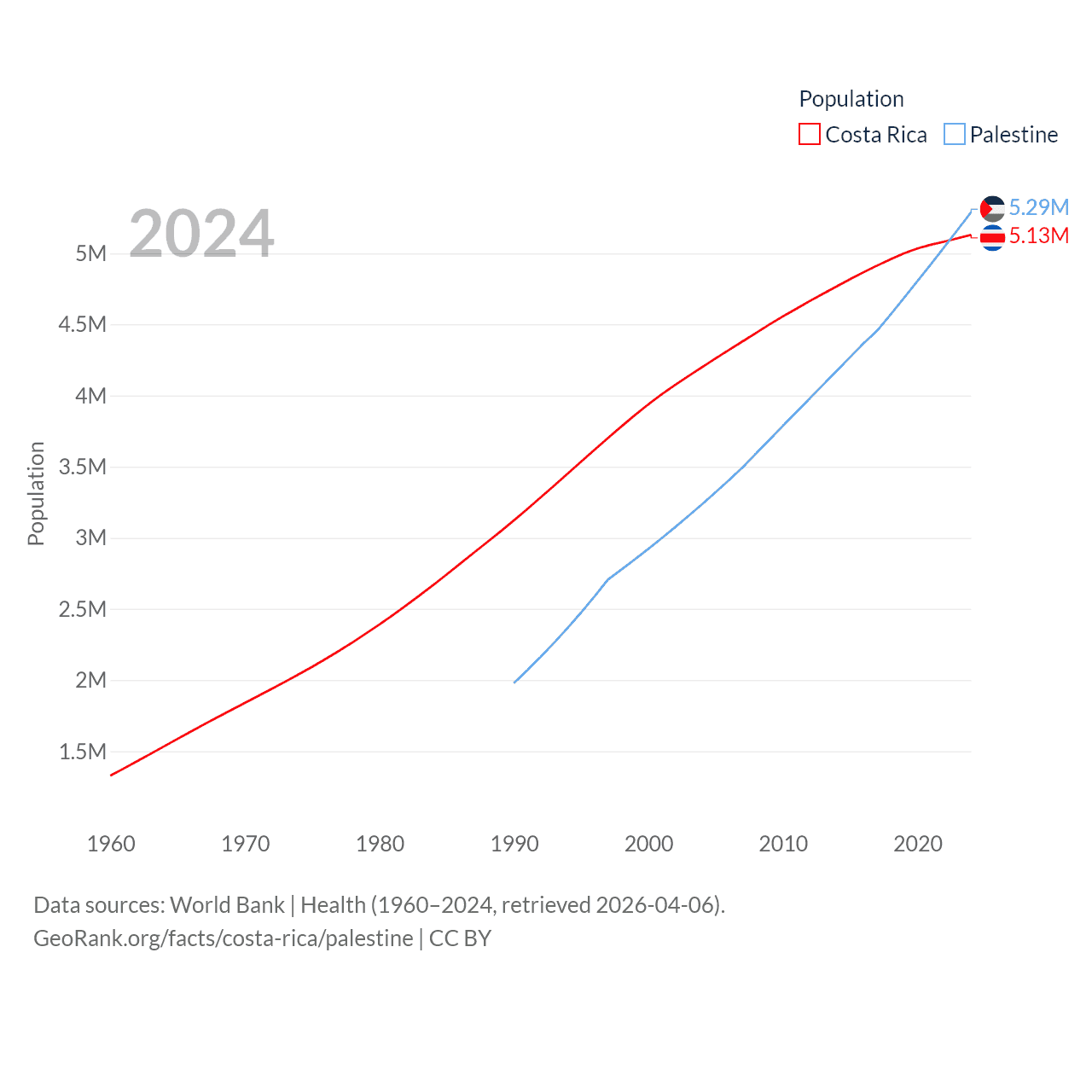 Costa Rica has a population of 5.13M (ranked 126/197), compared with 5.29M in Palestine (ranked 122/197). Costa Rica's land area is 19,714 sq mi versus 2,326 sq mi for Palestine (ranked 126th vs. 164th).