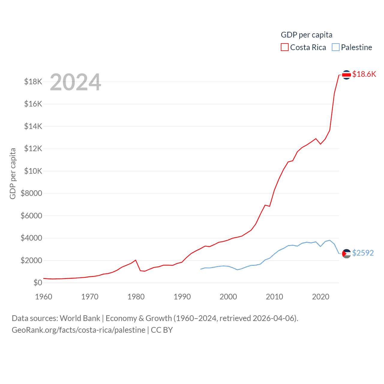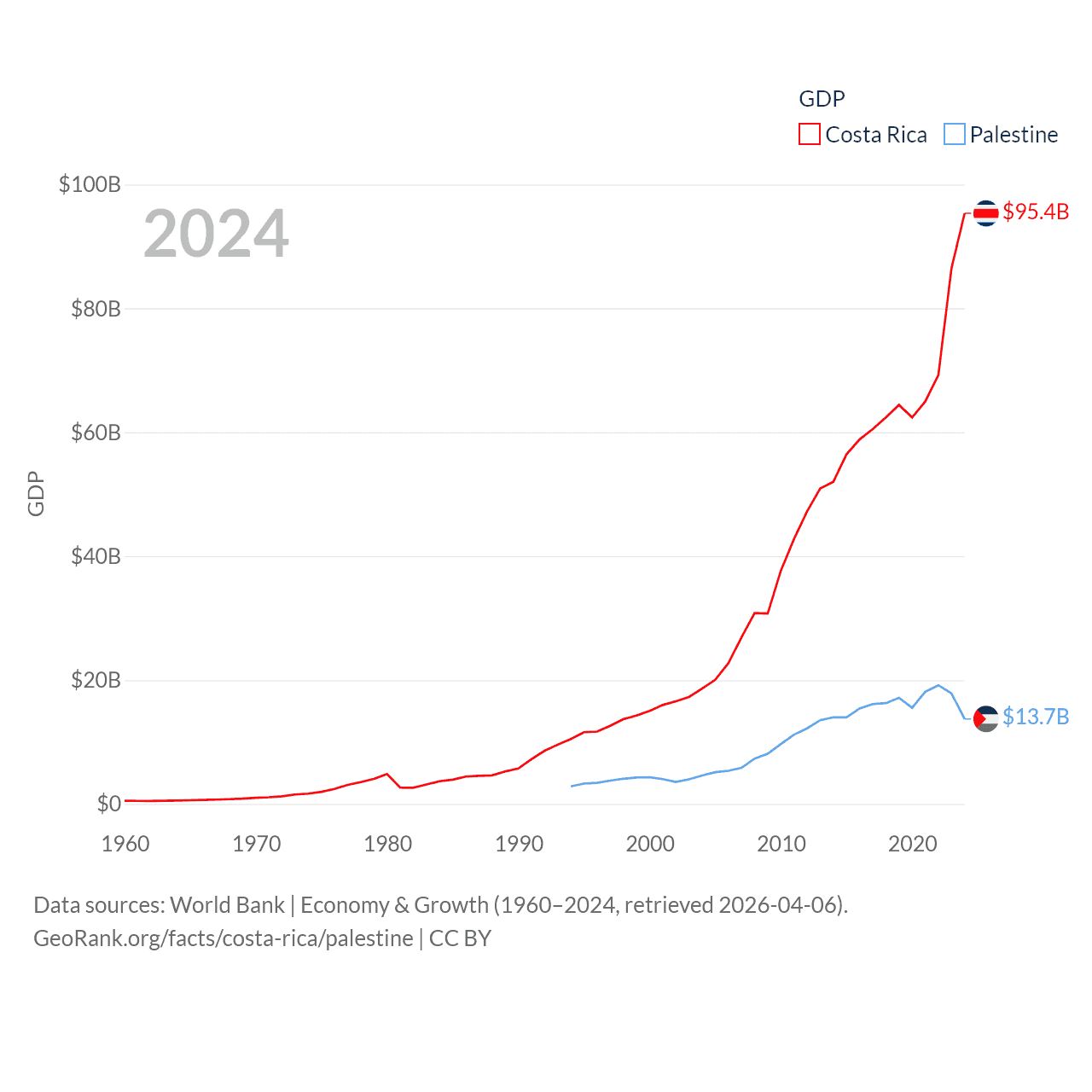 By GDP, Costa Rica ranks 73/197 ($95.4B) and Palestine ranks 146/197 ($13.7B). By GDP per capita, Costa Rica ranks 62/197 ($18,587), while Palestine ranks 147/197 ($2,592).