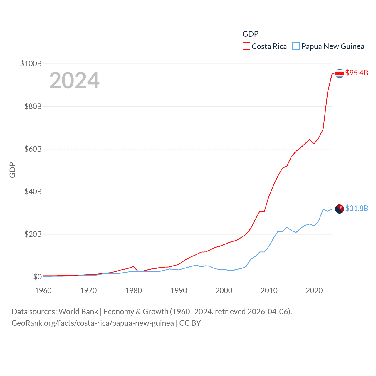 By GDP, Costa Rica ranks 73/197 ($95.4B) and Papua New Guinea ranks 110/197 ($31.8B). By GDP per capita, Costa Rica ranks 62/197 ($18,587), while Papua New Guinea ranks 140/197 ($3,007).