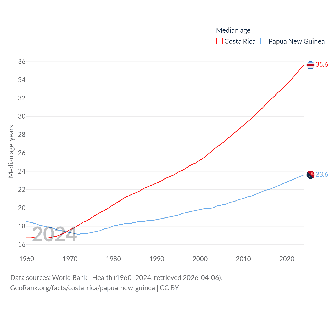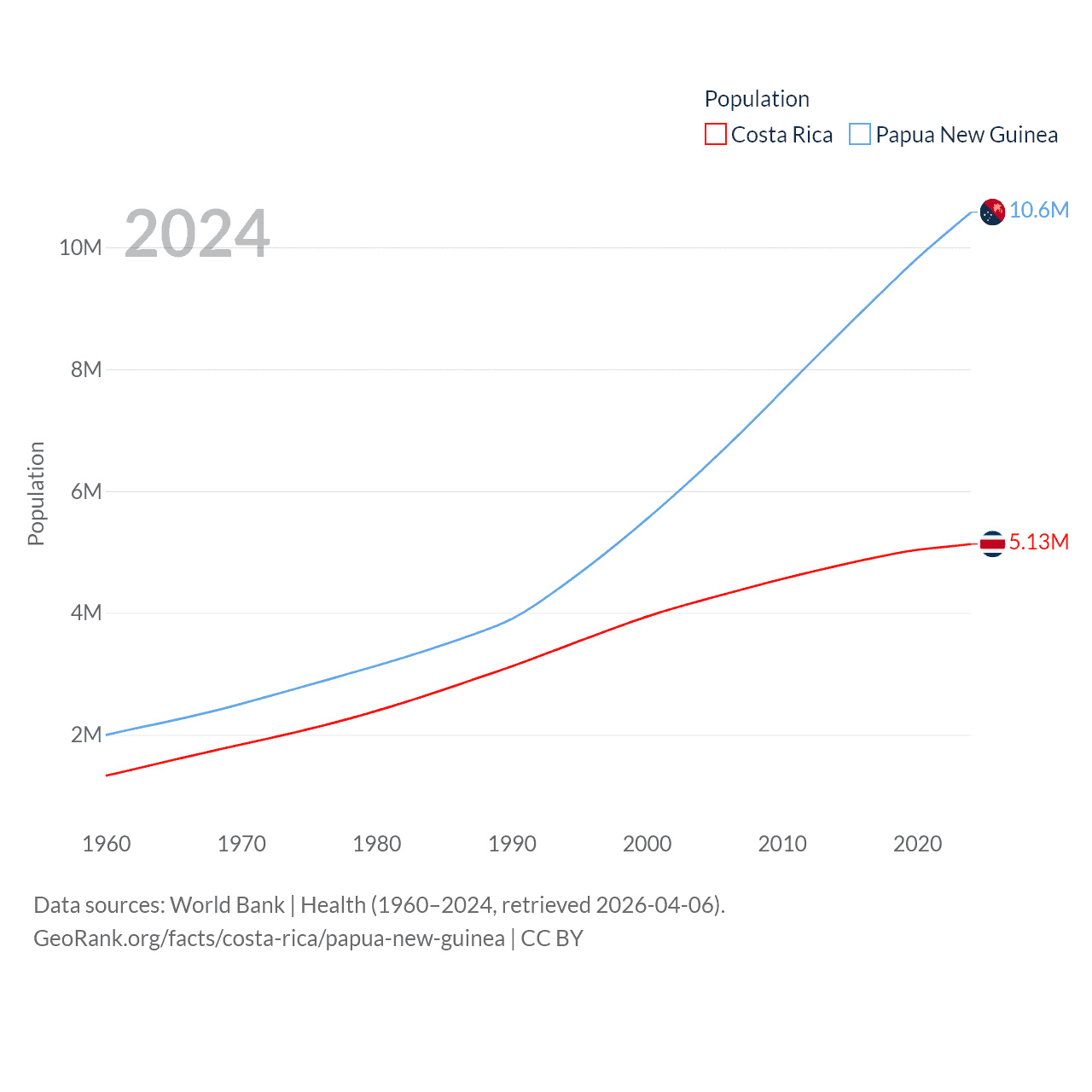 Costa Rica has a population of 5.13M (ranked 126/197), compared with 10.6M in Papua New Guinea (ranked 92/197). Costa Rica's land area is 19,714 sq mi versus 174,850 sq mi for Papua New Guinea (ranked 126th vs. 54th).