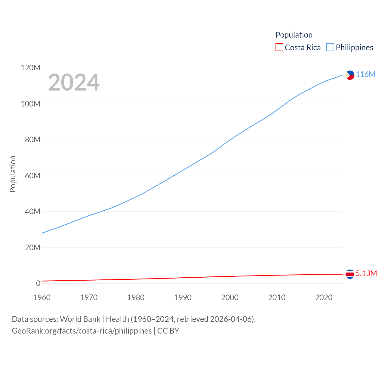 Costa Rica has a population of 5.13M (ranked 126/197), compared with 116M in The Philippines (ranked 14/197). Costa Rica's land area is 19,714 sq mi versus 115,124 sq mi for The Philippines (ranked 126th vs. 71st).