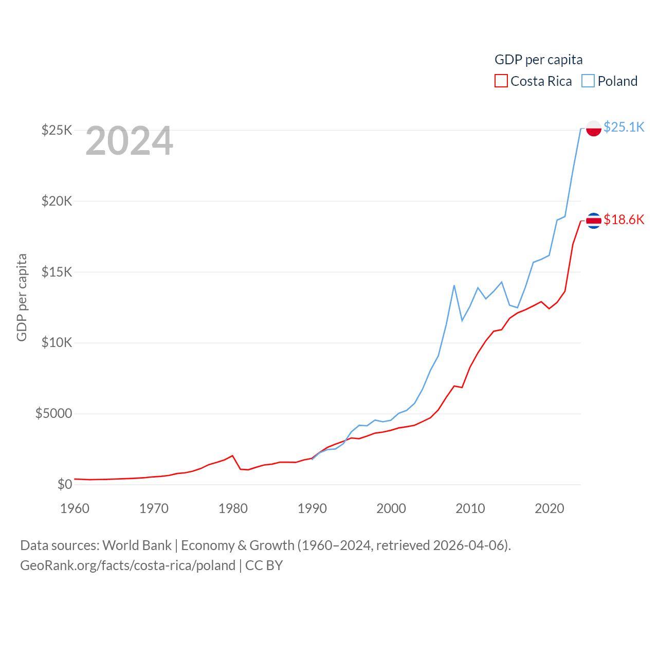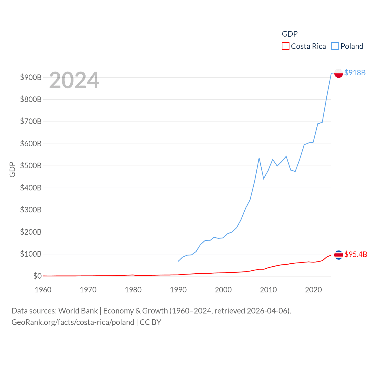 By GDP, Costa Rica ranks 73/197 ($95.4B) and Poland ranks 21/197 ($918B). By GDP per capita, Costa Rica ranks 62/197 ($18,587), while Poland ranks 48/197 ($25,104).