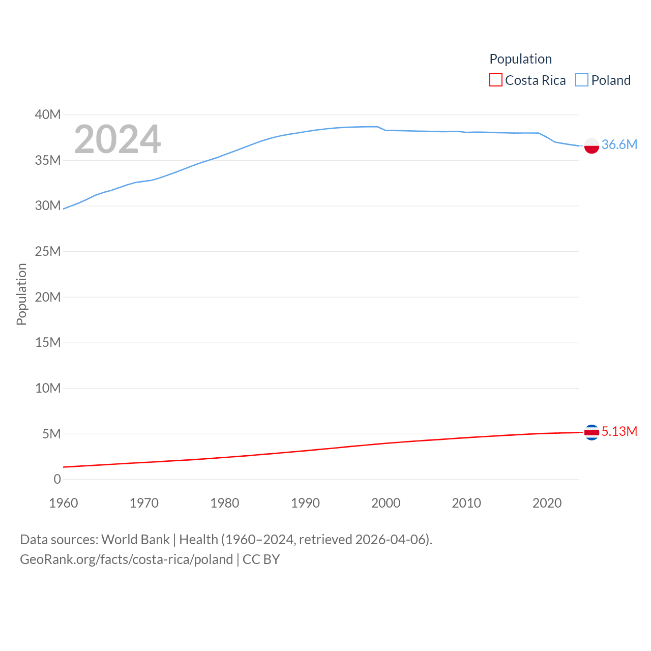 Costa Rica has a population of 5.13M (ranked 126/197), compared with 36.6M in Poland (ranked 42/197). Costa Rica's land area is 19,714 sq mi versus 118,252 sq mi for Poland (ranked 126th vs. 69th).
