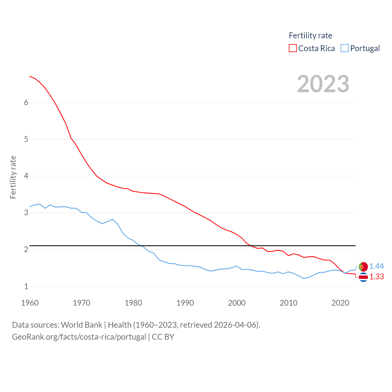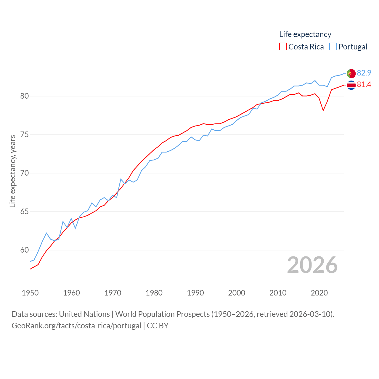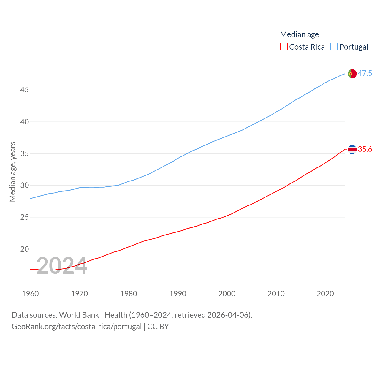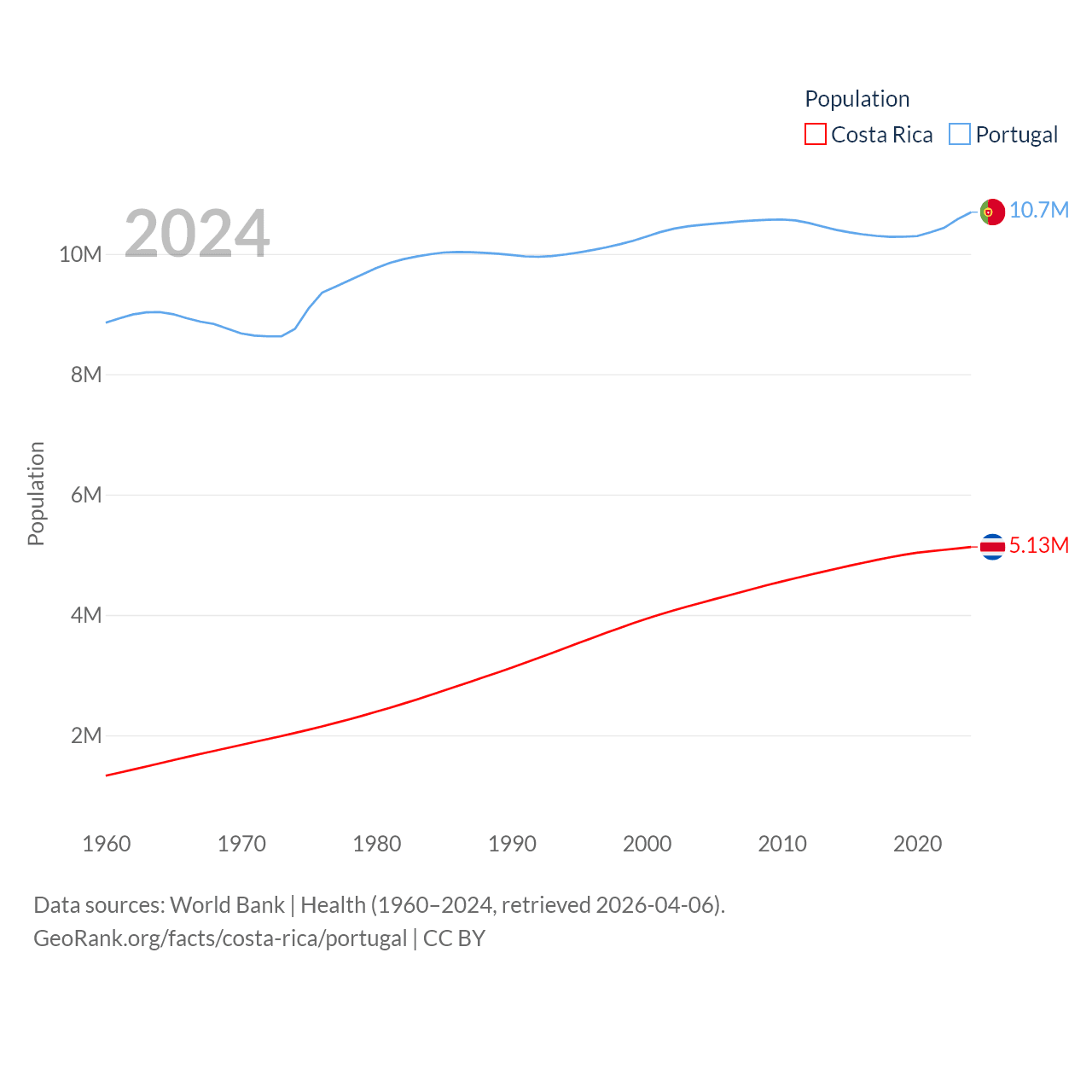 Costa Rica has a population of 5.13M (ranked 126/197), compared with 10.7M in Portugal (ranked 90/197). Costa Rica's land area is 19,714 sq mi versus 35,369 sq mi for Portugal (ranked 126th vs. 108th).