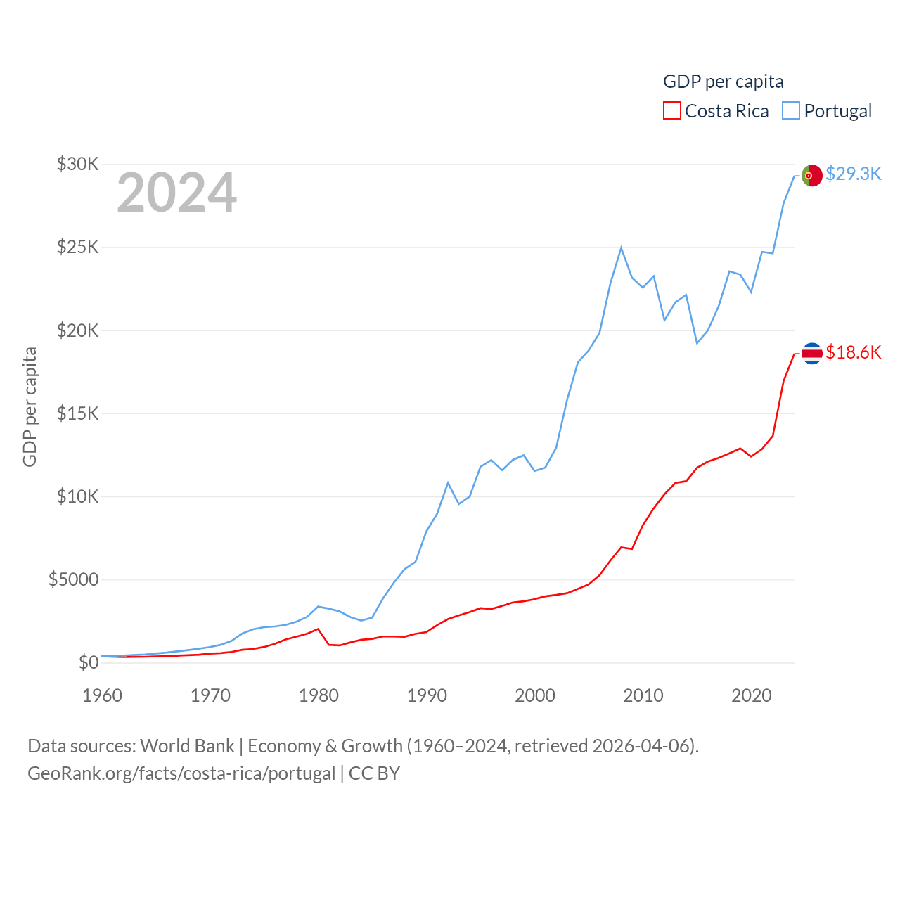 By GDP, Costa Rica ranks 73/197 ($95.4B) and Portugal ranks 46/197 ($313B). By GDP per capita, Costa Rica ranks 62/197 ($18,587), while Portugal ranks 44/197 ($29,292).