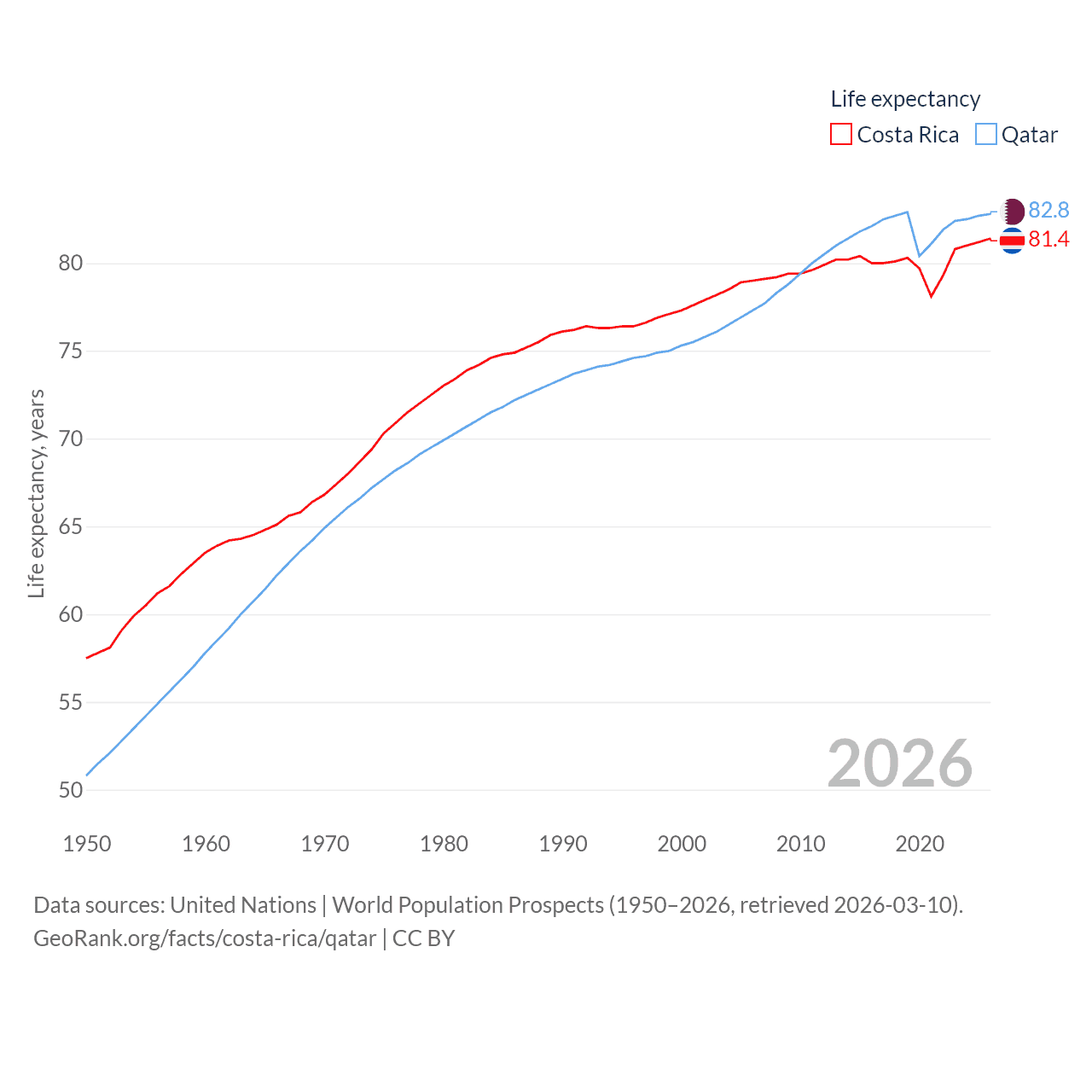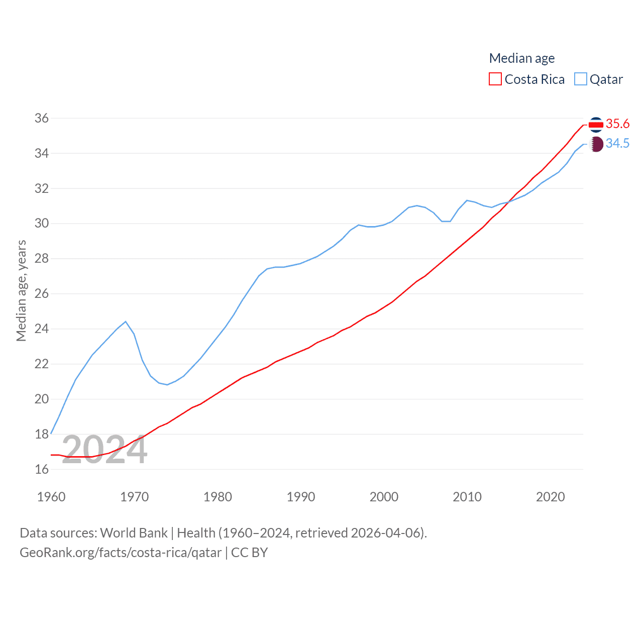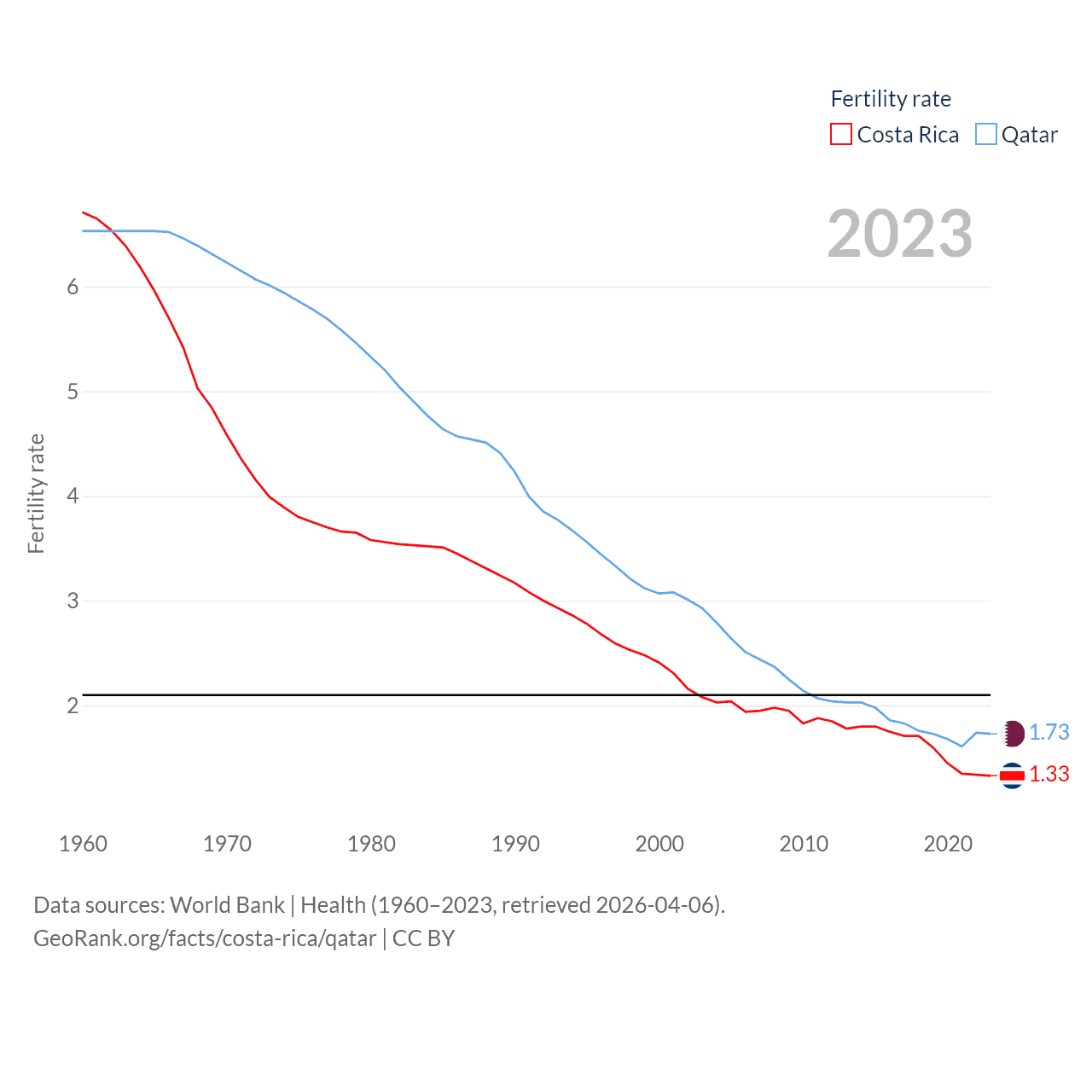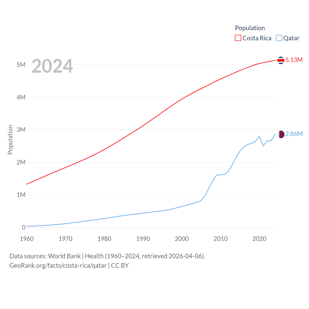 Costa Rica has a population of 5.13M (ranked 126/197), compared with 2.86M in Qatar (ranked 138/197). Costa Rica's land area is 19,714 sq mi versus 4,436 sq mi for Qatar (ranked 126th vs. 158th).