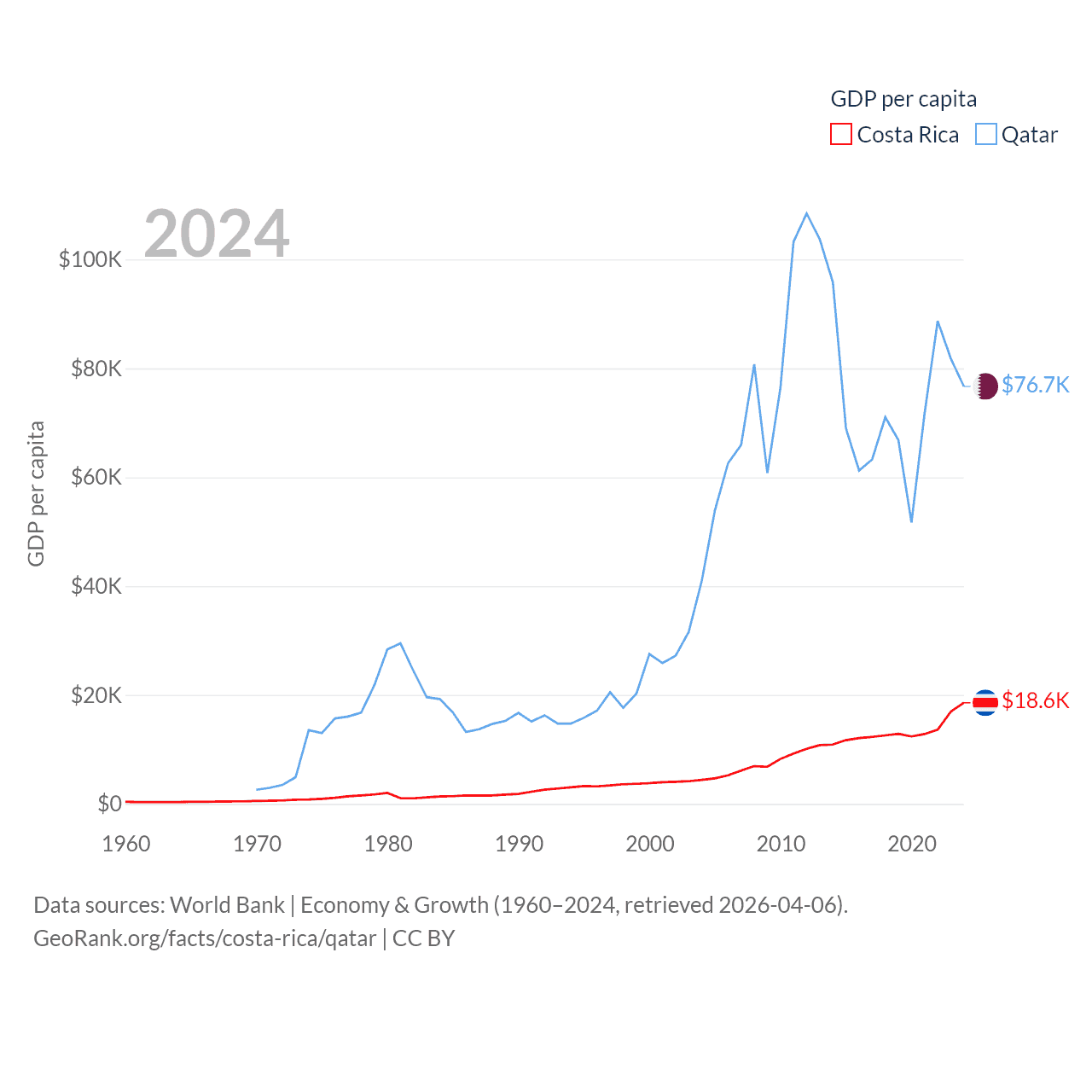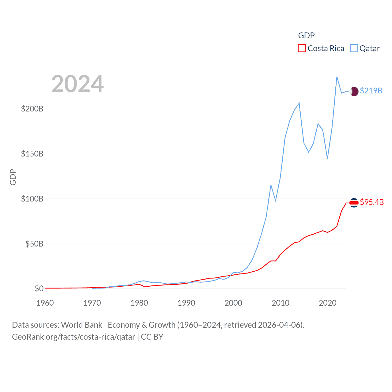 By GDP, Costa Rica ranks 73/197 ($95.4B) and Qatar ranks 56/197 ($219B). By GDP per capita, Costa Rica ranks 62/197 ($18,587), while Qatar ranks 11/197 ($76,689).