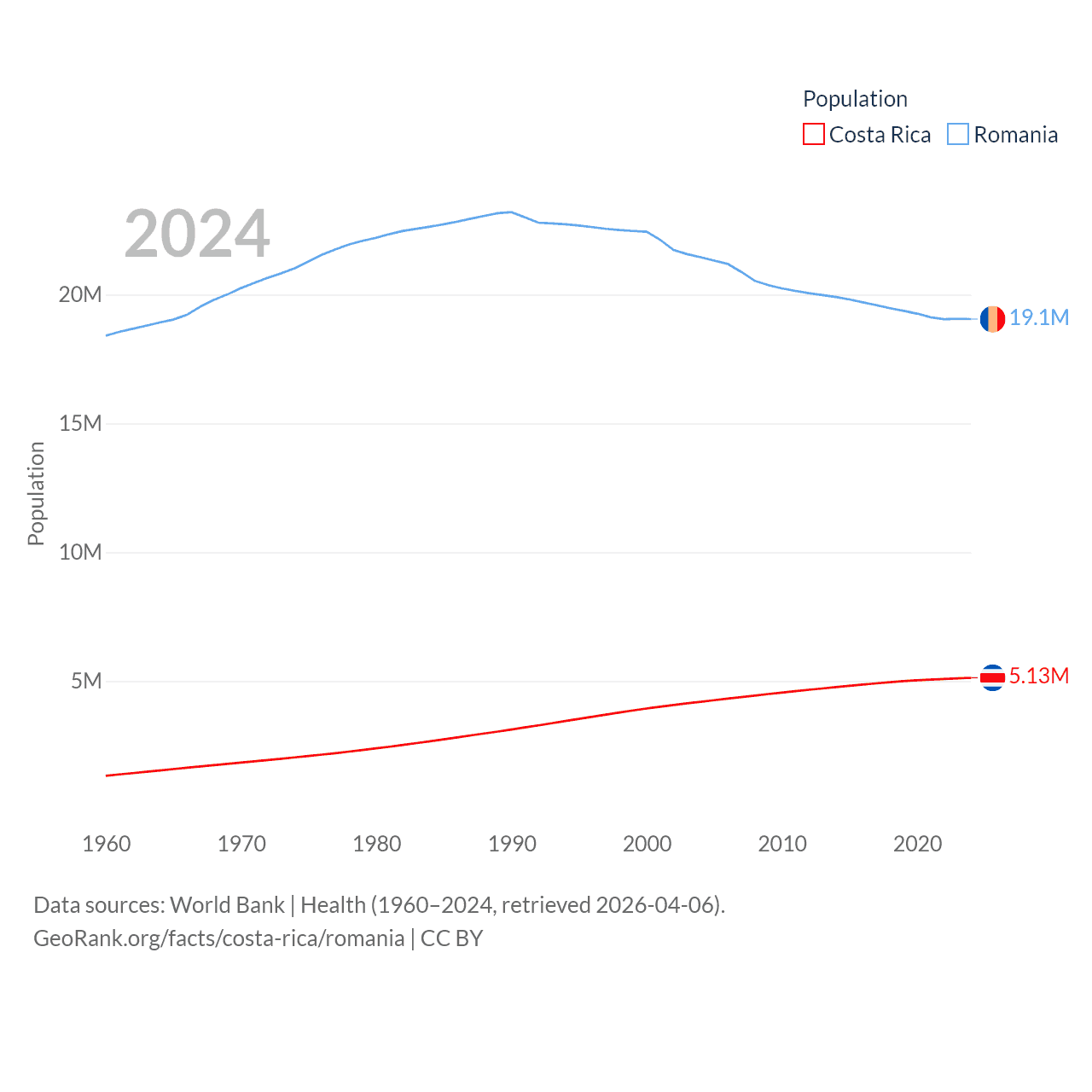 Costa Rica has a population of 5.13M (ranked 126/197), compared with 19.1M in Romania (ranked 67/197). Costa Rica's land area is 19,714 sq mi versus 88,834 sq mi for Romania (ranked 126th vs. 80th).